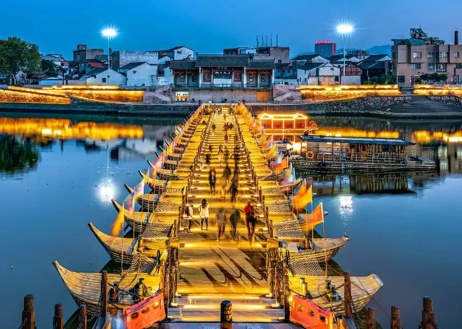 If the naturally advantageous waterway contributed to the ancient town's commercial prosperity, the Wanshan Bridge, first built in the early years of the Qianlong period of the Qing Dynasty, and subsequently renovated many times to preserve the century-old glory of the Buddhist temple, witnessed the ancient town's most prosperous era.