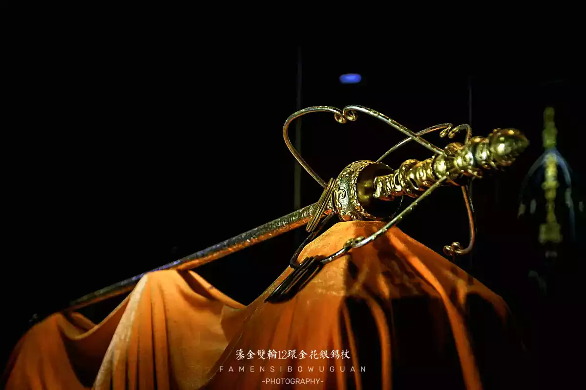 "The King of Staffs in the World" - the twelve-ring staff with silver and gold flowers to welcome the true body. This staff is the earliest, largest, highest-grade and most exquisitely made Buddhist ritual implement discovered in the world.