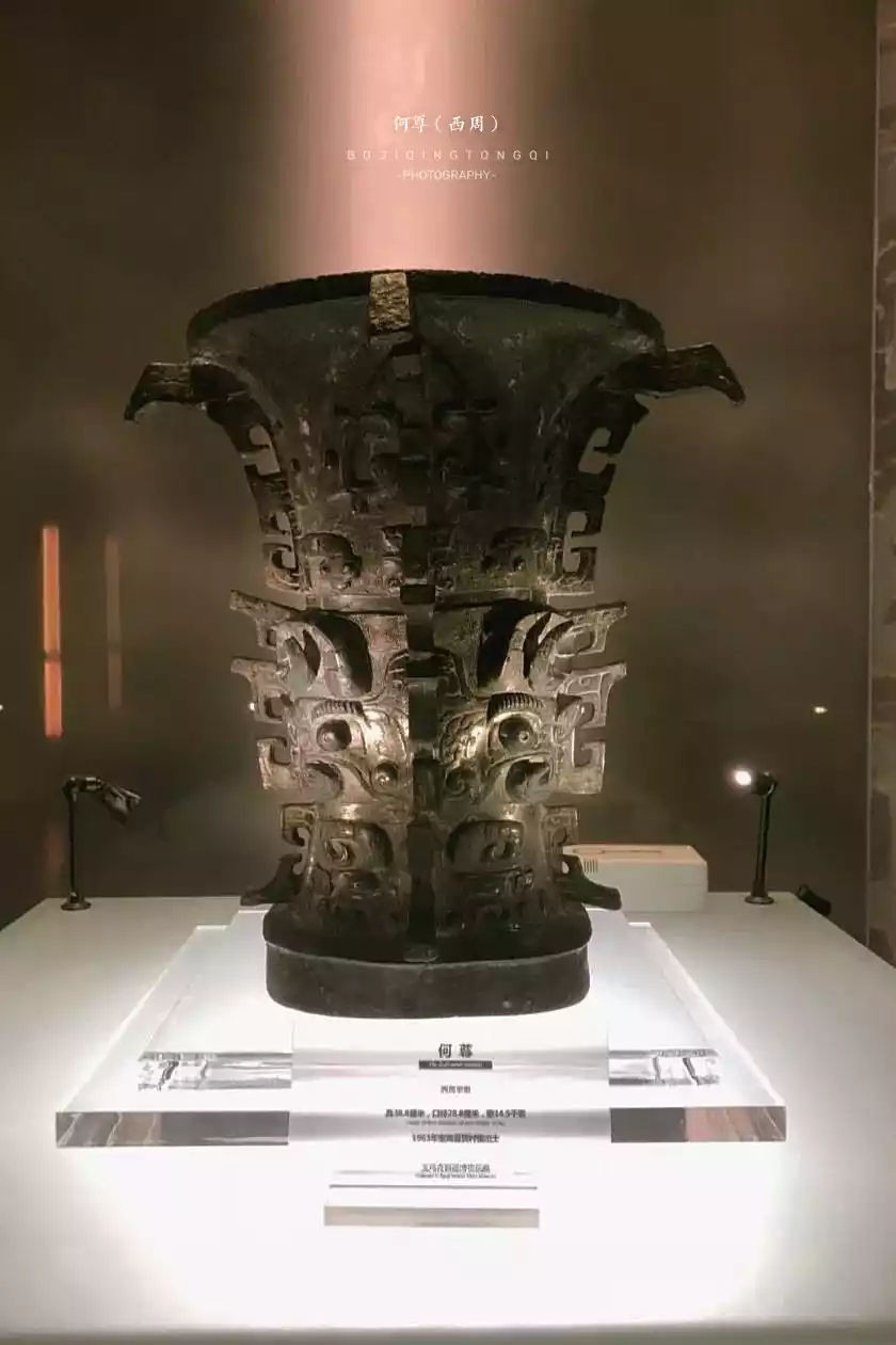 The He Zun, a bronze vessel crafted by a nobleman surnamed He during the reign of King Cheng of the Western Zhou Dynasty, is a precious work of art from the early Western Zhou Dynasty. The vessel's base bears an inscription of 122 characters, three of which are damaged, leaving 119 remaining. Among them, "Ze Zi Zhongguo" (roughly meaning "I want to live in the center of the world," referring to Luoyang) is the earliest written record of "China."