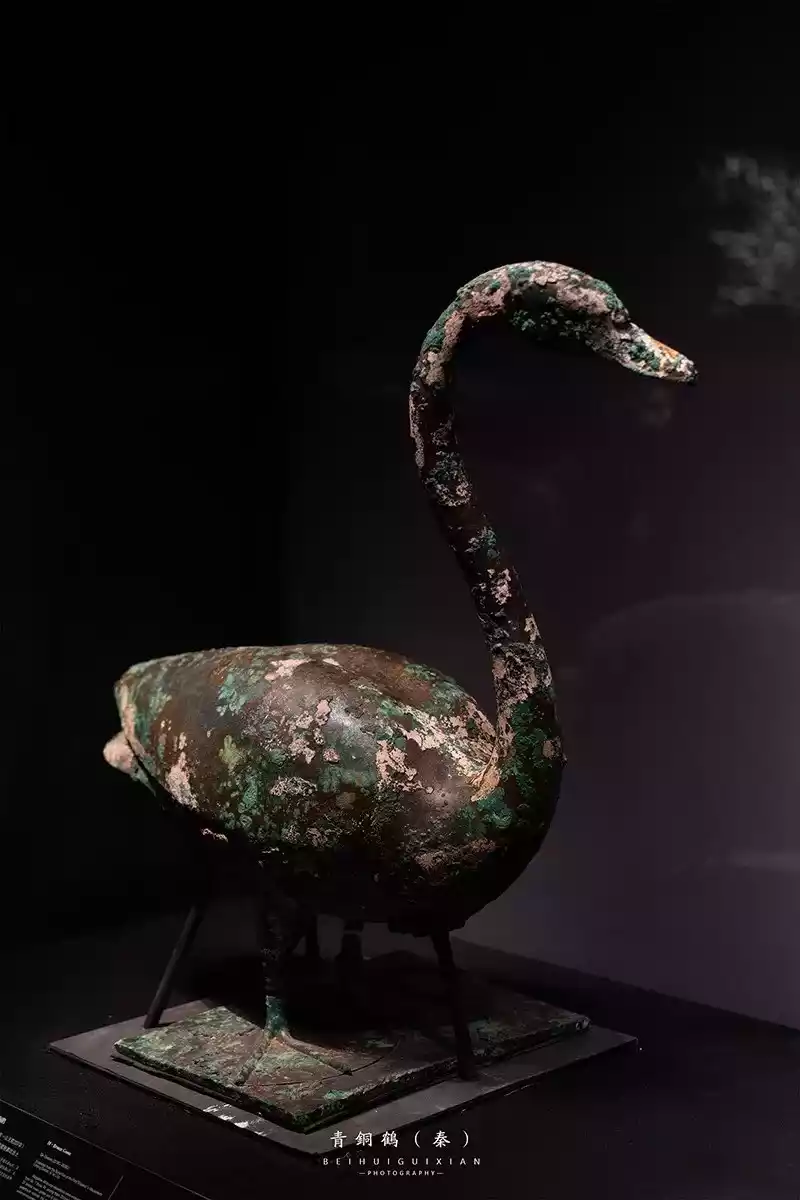 Here is a green-faced bronze crane from the Qin Dynasty, which is said to be the Qin Shi Huang's magical artifact for seeking immortality. It reveals the secrets of the bronze making technology of the Qin Dynasty.