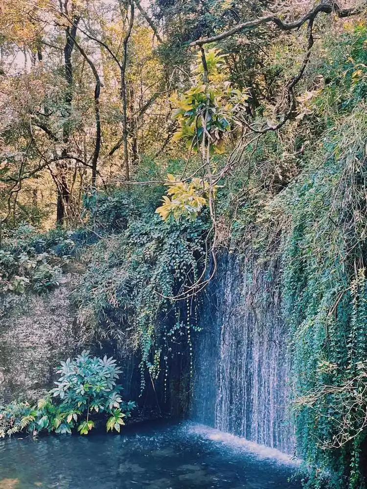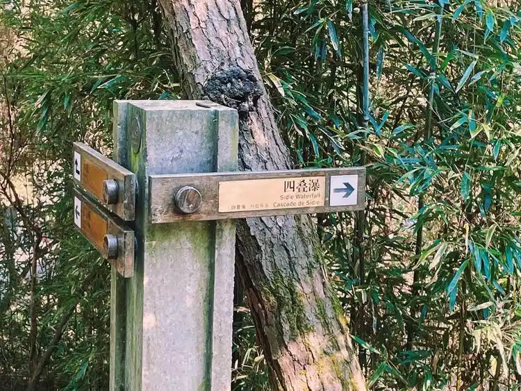 The Four-Layer Waterfall looks like a small man-made waterfall. The water flow is not large, and there are small circular steps under the waterfall to go over. Walking above the flowing water makes me feel a little excited.