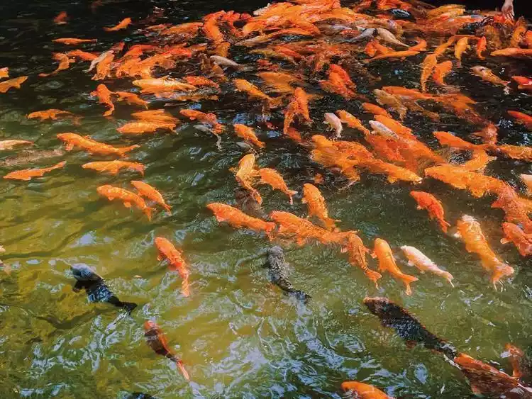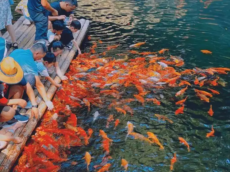 After passing the Four-Layer Waterfall, we arrived at Tianchi's most iconic attraction. The goldfish here are large and plump, gathered by the bamboo rafts, their mouths wide open, waiting for visitors to feed them. They look like they've been starving for ages, but theoretically, they should be well fed. Fish food costs 10 yuan a bag, perfect for children to get up close and personal with the fish.