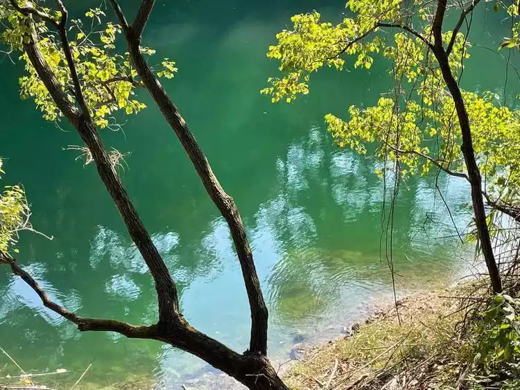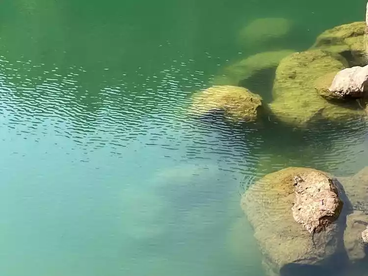 The water was clear and turquoise, and I reached in and gently stirred the water, feeling cool and comfortable. We paddled to the shade under the bridge and rested for a while. The cool breeze blew across the lake, which was so comfortable that I almost fell asleep.