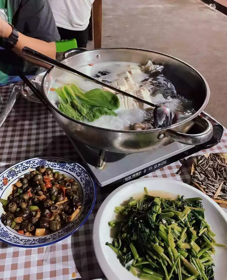 We found this highly-rated farmhouse restaurant, "Qinglu," on Dianping. It was almost dark when we arrived, and there were still quite a few customers, so we had to wait for a table. Their dishes were generally farm-style, and the fish soup was incredibly generous; it felt like four people couldn't finish it all. I wouldn't recommend going there specifically for a quick check-in.