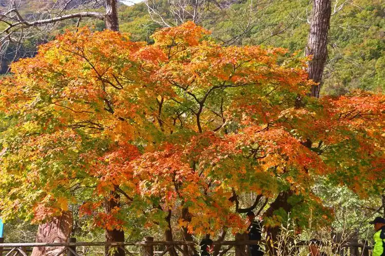 We stumbled upon Maple Queen while driving from Yanghugou to Dashihu. It's located on the side of a mountain road, right next to a stream. When we reached this area, the streamside was packed with cars, and people were gathered at the stream below. We followed a fork in the road down to the streamside, parked our car, and wanted to see what it was all about. Walking along the streamside, we found maple trees all along the bank, but the most striking one was the Maple Queen, the one everyone came for. Upon asking, we learned that this was the Maple Queen in the lake. It was truly different from the other maple trees, several times larger than the surrounding ones, and from a distance, it was lush and leafy.