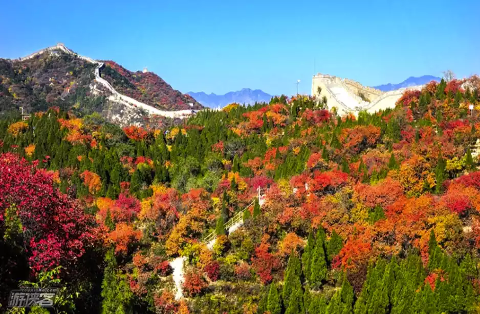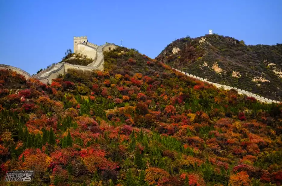 Not only are there crimson leaves covering the mountains here, but you can also see the Badaling Great Wall in the distance and the remains of the Great Wall up close. The crimson leaves and the Great Wall complement each other, creating a breathtaking spectacle of autumn beauty in northern China.
