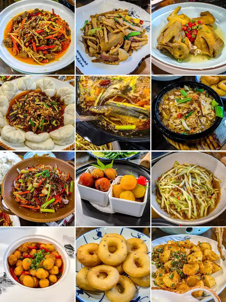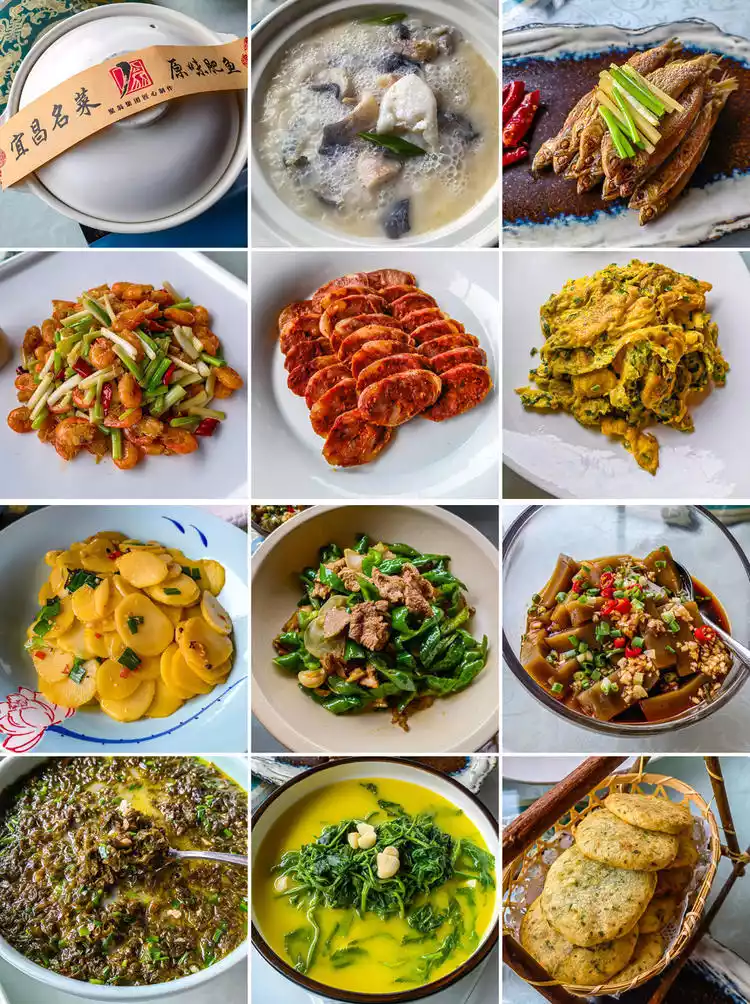 Fresh river shrimp and small fish from the Three Gorges are fried to a crispy, fragrant finish. The owner's signature wild vegetable pancakes are especially delicious when eaten hot. Tujia sausages, baby potatoes, and homemade scrambled eggs complete the table, creating a delicious and savory experience. A must-try when visiting the Three Gorges in Yichang, especially the original fatty fish.