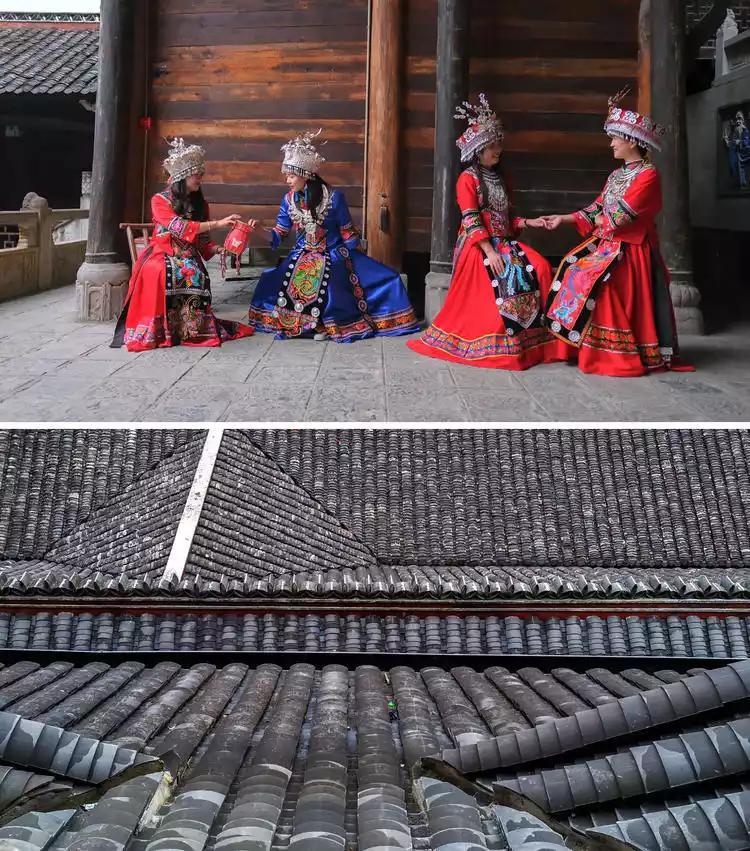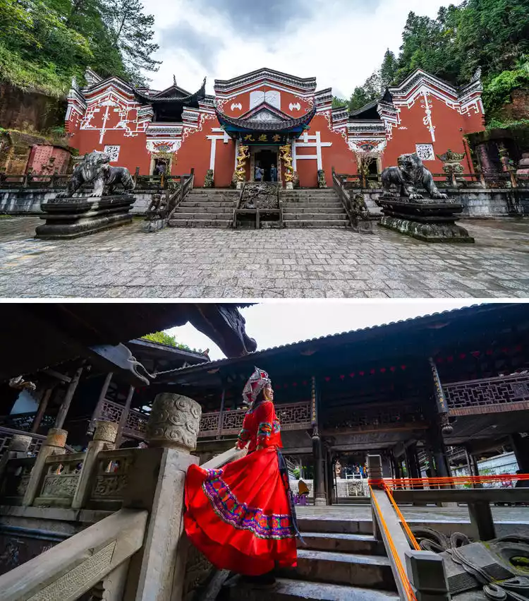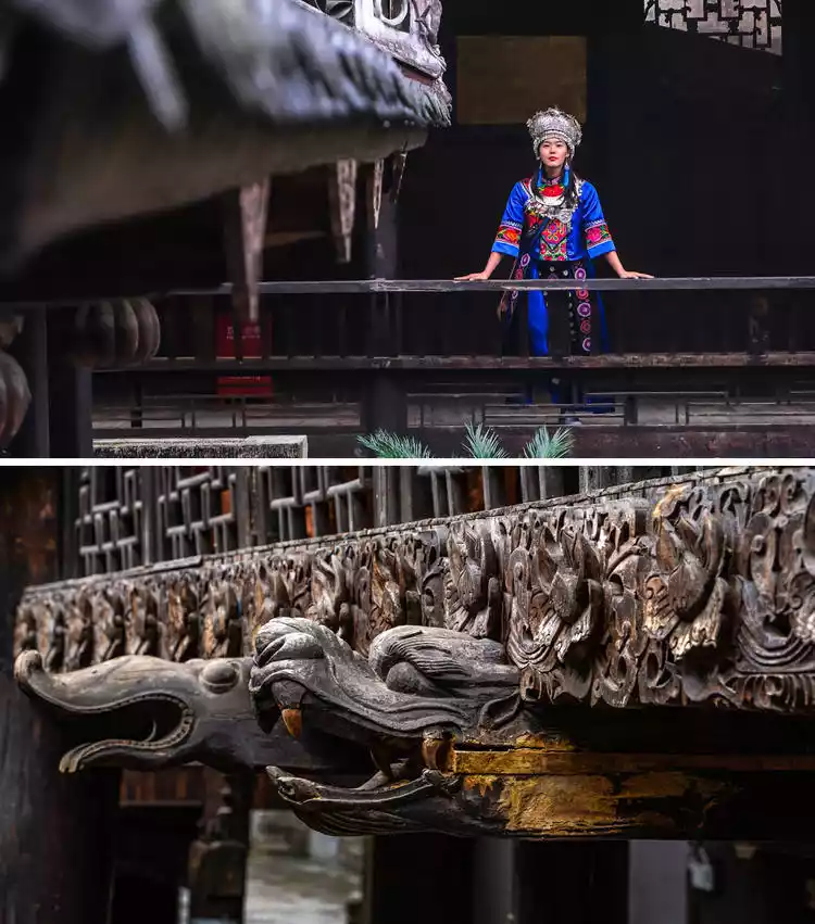 The Jiujin Hall, the core of the Tusi City, is composed of 333 pillars, 333 stone column bases, 330 doors, thousands of carved wooden windows, over a thousand purlins, and tens of thousands of oak logs. It is a rare example of a purely mortise and tenon-jointed wooden structure in China. The hall is dotted with pavilions, terraces, and corners, with eaves and claws rising and falling in a staggered pattern, exuding grandeur, majesty, and splendor. Ideal photo spots include the eaves, staircases, corridors, beauty chairs, windows, and sculptures.