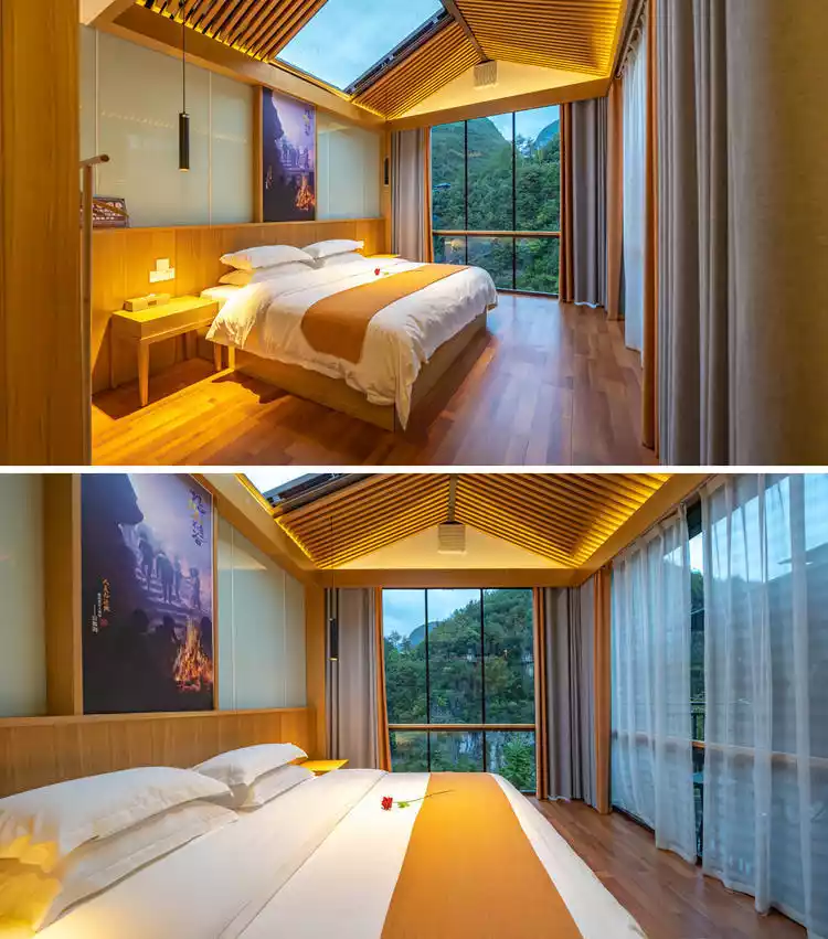 By the way, I would also like to recommend to you the "Ya She", a hotel that is actually built on the edge of a cliff. It is right next to the Earth's Core Valley Visitor Center and the glass bridge. It is built on a cliff with a vertical height of 356 meters. It has a view of the canyon on three sides and a beautiful 270-degree view. There are a total of 26 guest rooms, all of which are independent viewing rooms. The visual effect is really amazing. Without further ado, stay here for one night before leaving.