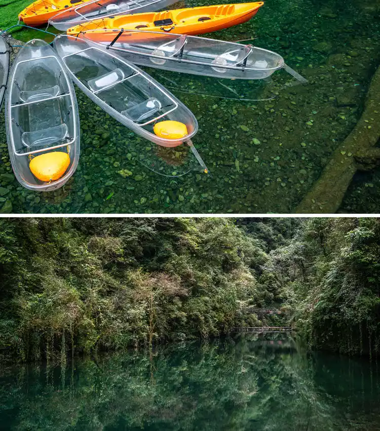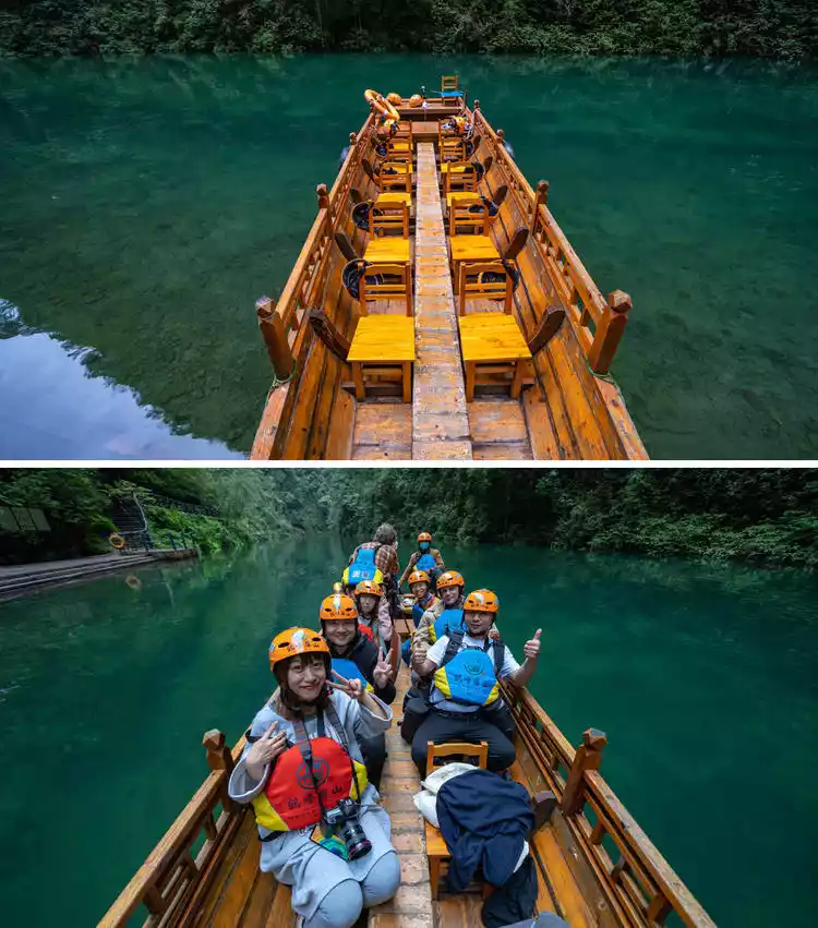 Pingshan Canyon is surrounded by cliffs suspended in the air, and the canyon's waters flow freely. Looking up, you'll see towering cliffs and a cascading stream. Boats sailing through the clear waters feel like floating on a mirror. This magical sight has earned Pingshan Canyon its reputation, earning it the nickname "China's Semporna." Small boats like these are called "spaceships."