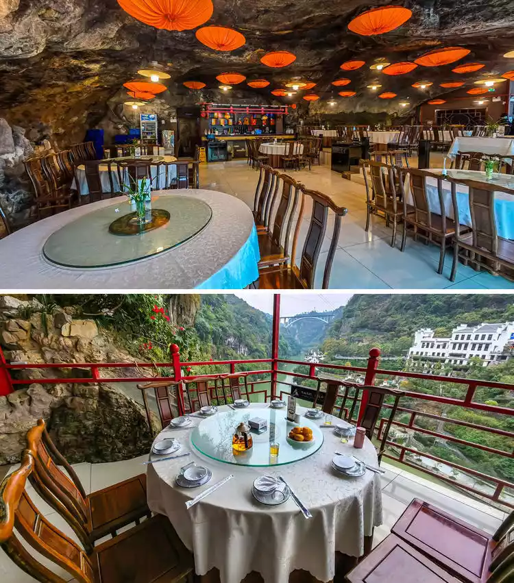 Fangweng Restaurant is named after Lu You (pen name Fangweng), a renowned patriotic poet of the Southern Song Dynasty. He left the famous line "The coins in my bag are passed down throughout the world; I cannot taste anything other than a famous spring." Later, locals built a restaurant on the site in his memory, hence the name Fangweng Restaurant. The restaurant is located within a cave perched on a sheer cliff. Below, a sheer cliff reveals a hidden world within. It is adjacent to the renowned Sanyou Cave, and across the river is the nationally renowned Three Gorges Bungee Jumping.