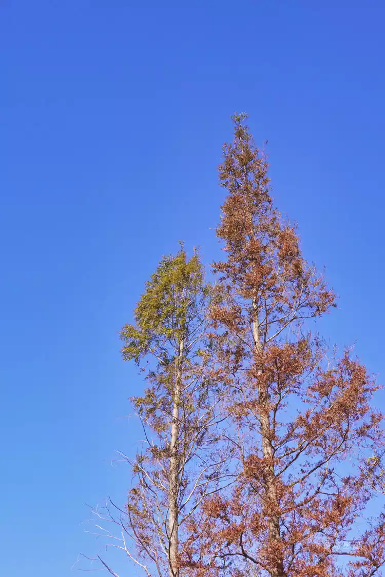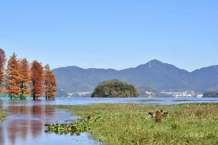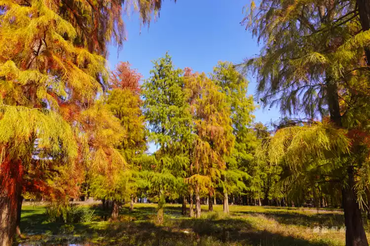 At the end of November, the Metasequoia trees have begun to turn red. The red, orange, yellow and green colors are very layered under the slanting sunlight. The vast tracts of Metasequoia trees, the blue sky and white clouds, and the breeze-swaying Siming Lake merge into a dynamic picture.
