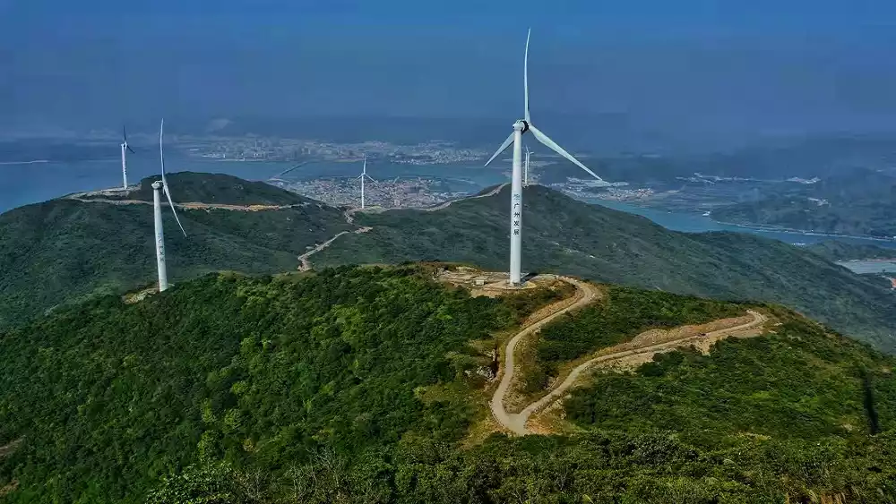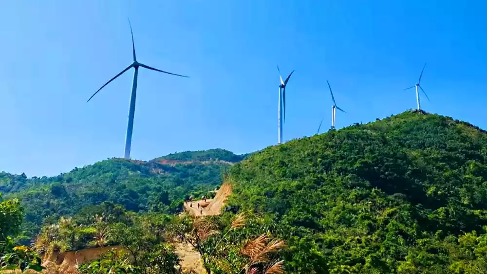 Rising tall among the green mountains and forests, the silver-white windmills, together with the blue sea, blue sky, beach, wetland and pristine countryside, form a beautiful scene on earth.