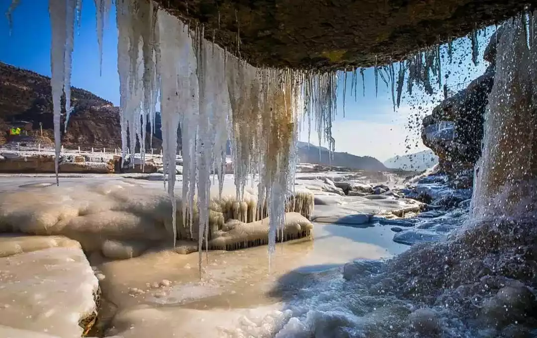 In February, at the Hukou Waterfall on the Yellow River, you can stand on the shore to admire the glacier and listen to the sound of the Yellow River rushing beneath the surface.