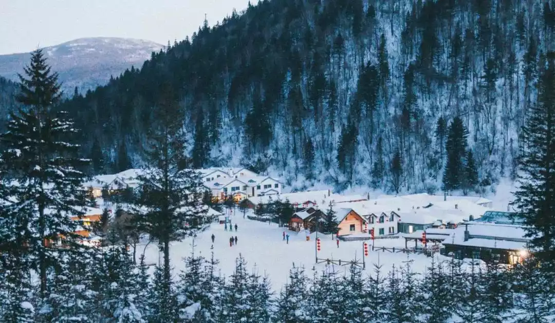 If the weather is good and the clouds disperse, you can see the beautiful and staggered snow-capped mountain tops, the small houses at the foot of the mountain, the red wooden plank road, and the frozen lake. It feels like you have traveled to a winter wonderland.