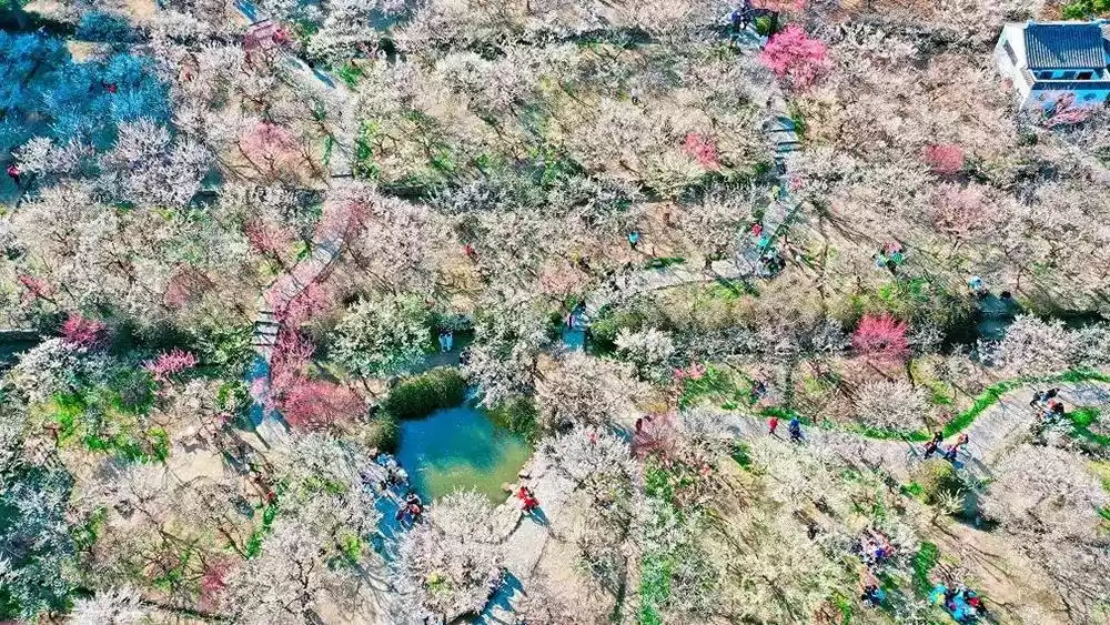 Looking around, flowers are in full bloom, the mountains are green and plum blossoms are gorgeous. Passing by the plum forest, the faint fragrance is so refreshing that you can't help but linger there.