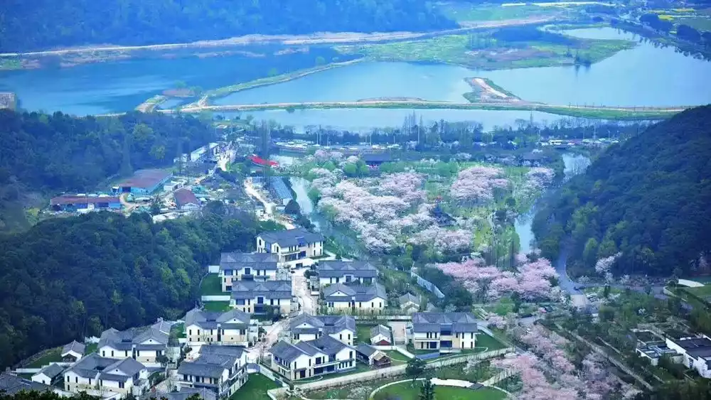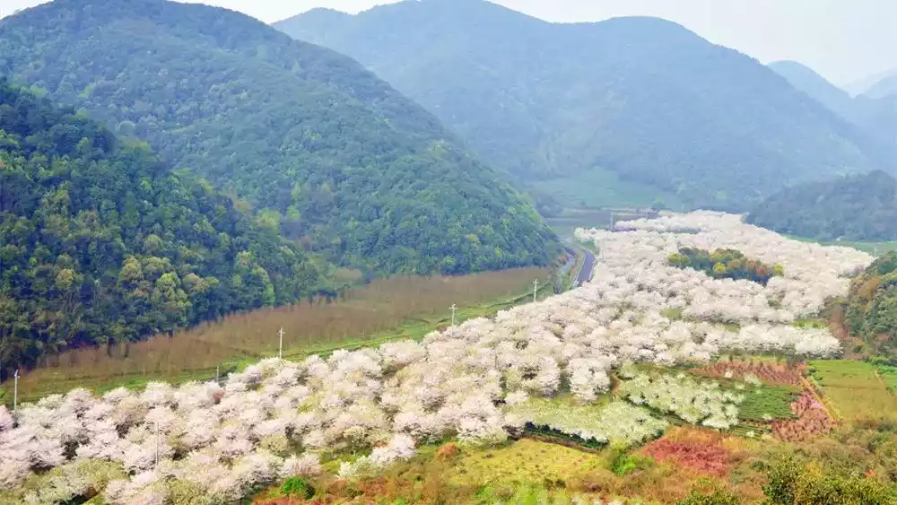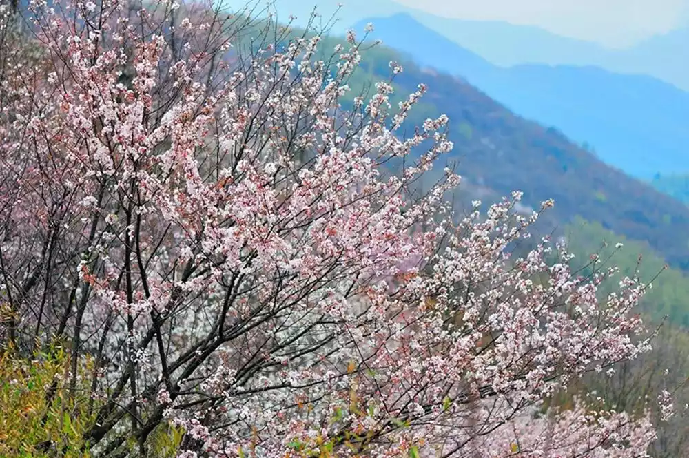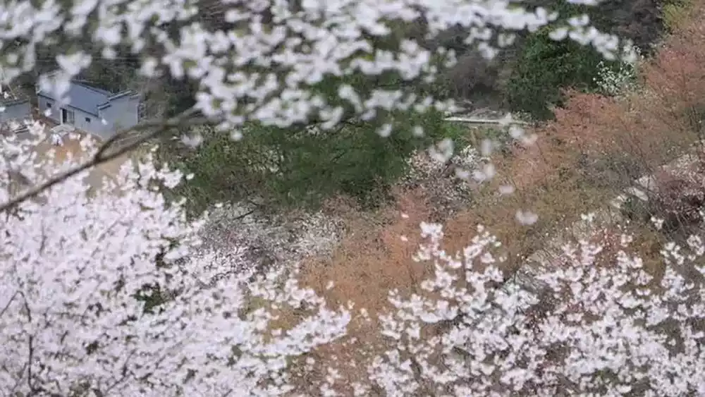 Pure white and light pink cherry blossoms are interspersed among the green mountains and forests. They are bright and brilliant like brocade when the weather is sunny, and gorgeous when it rains, like a fairyland.