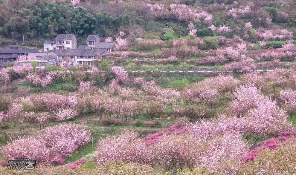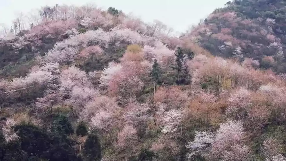 The cherry blossoms at Yoshino Mountain in Chun'an County are all natural mountain cherry blossoms. There is a 2-kilometer-long hiking trail here, also known as the "Sakuragi Flower Road."