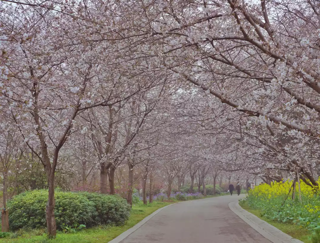 The cherry blossom forest stretches for several kilometers. The warm spring sunshine has prompted large areas of cherry blossoms to bloom, like snow and clouds, blooming brilliantly. When the wind blows, a romantic cherry blossom rain falls.