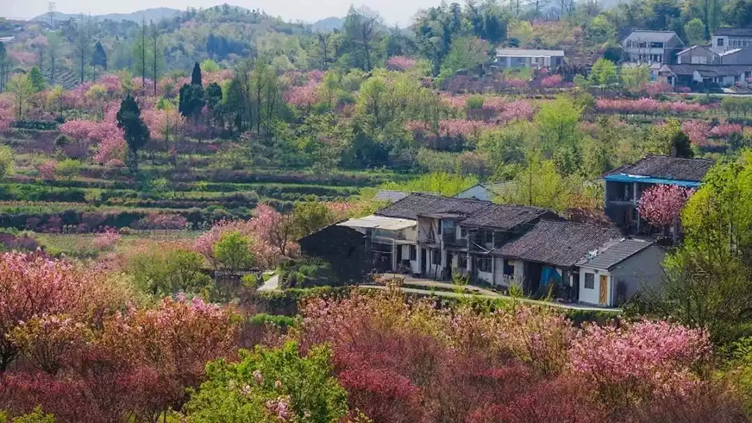 A country road used to transport flowers and trees has become a beautiful cherry blossom viewing route. The hillsides on both sides are planted with cherry blossoms. The view from the top of the mountain is wide, and smoke from the village is curling up.