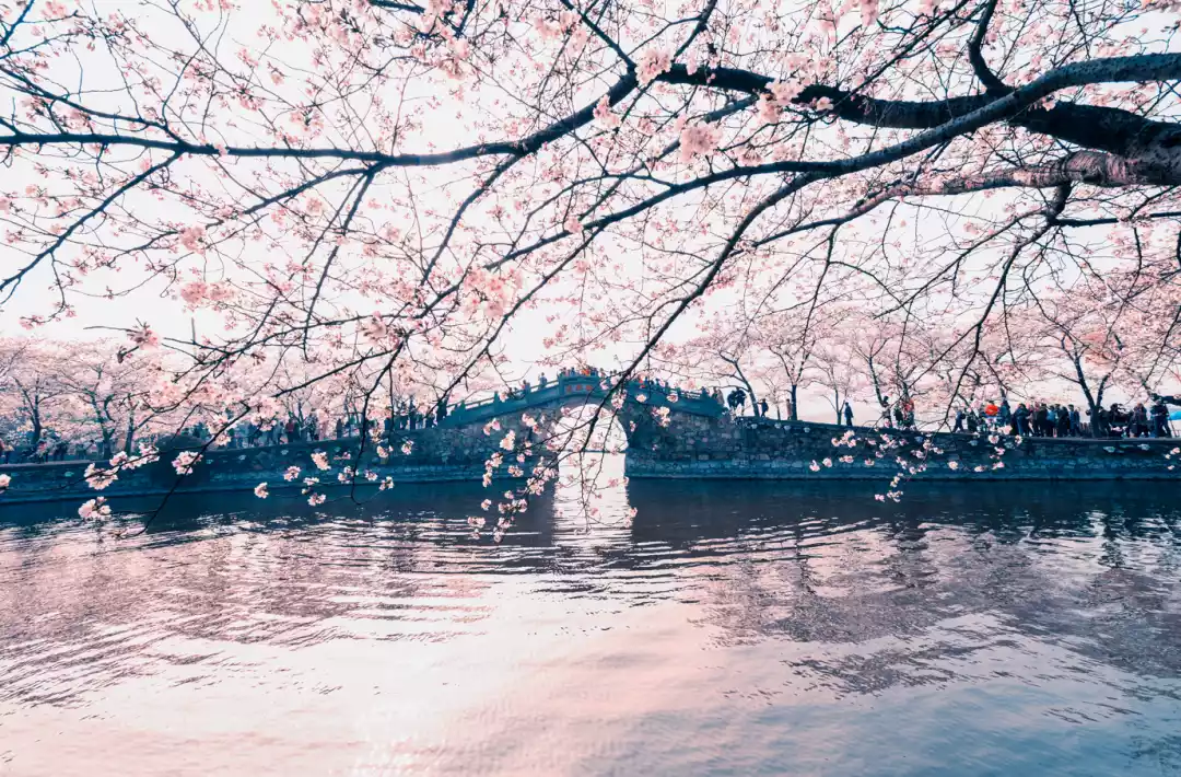 The spring water of Taihu Lake is just beginning to emerge, and the spring forests on both sides are just beginning to flourish. The spring breeze blows for ten miles, blowing down cherry blossoms like rain. With the lake and the bridge, it is even more perfect, and the scenery is really "wonderful"!