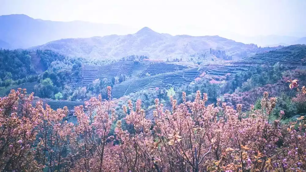 The tea fields are dotted with trees full of bright cherry blossoms, and it is no exaggeration to call it the "Wuliang Mountain of Zhejiang".