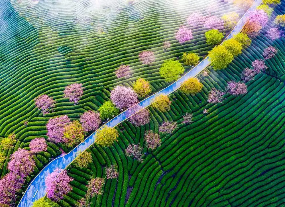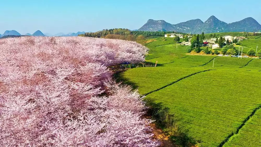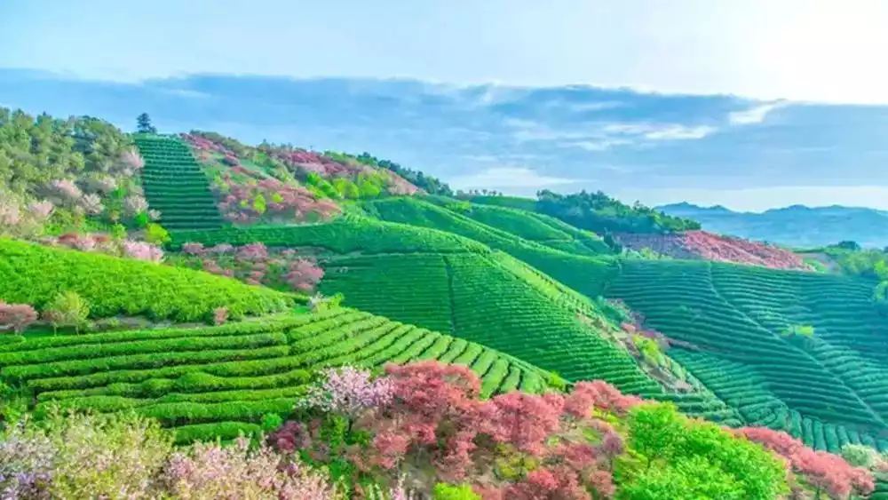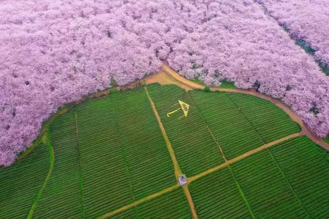 Tea fields are interspersed with cherry blossoms, which complement each other, creating a unique beauty of charming cherry blossoms and the fragrance of tea all over the mountain.