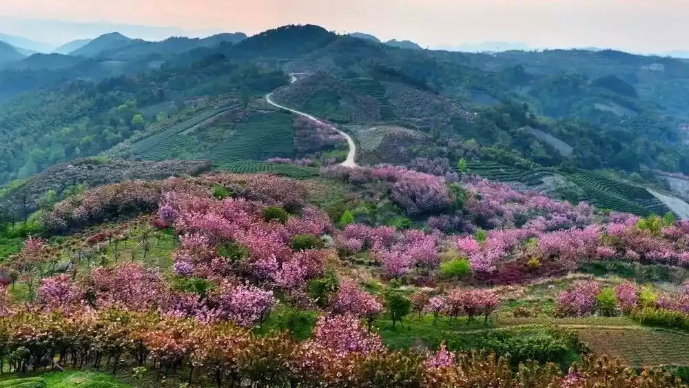 Spring in Yuyao, the "Back Garden of Eastern Zhejiang," is a vibrant spectacle of cherry blossoms, crabapple trees, and tea fields. Dalan is a renowned Chinese cherry blossom center, and from the top of the tea fields, you can admire the winding, 800-mile-long Siming Mountains.