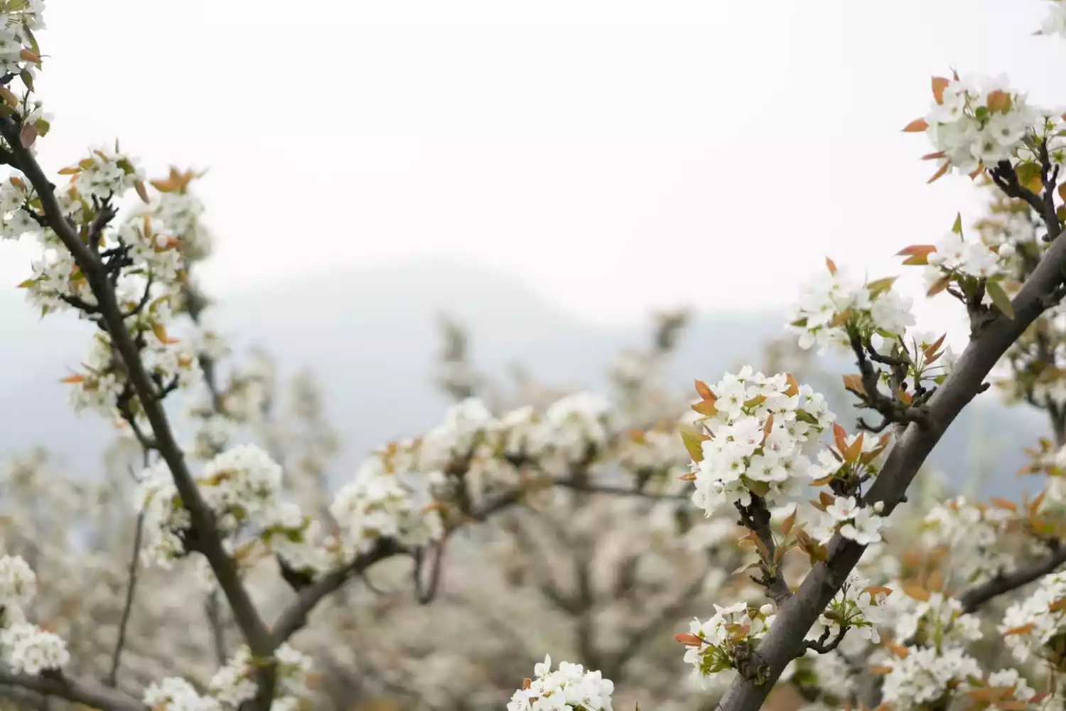 Pear blossoms are pale white and inconspicuous compared to other flowers. When they bloom, they are as white as snow and as transparent as pearls.