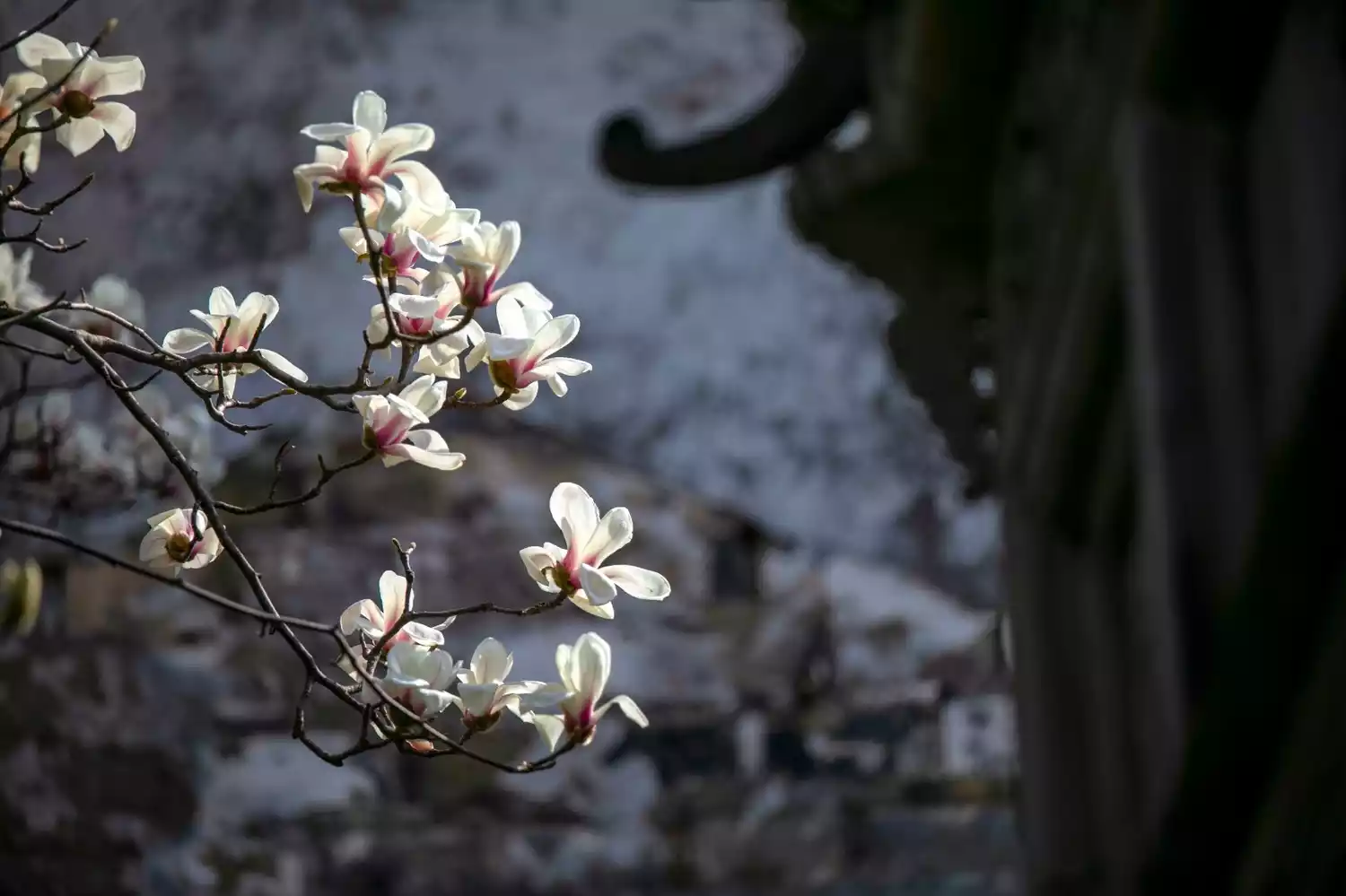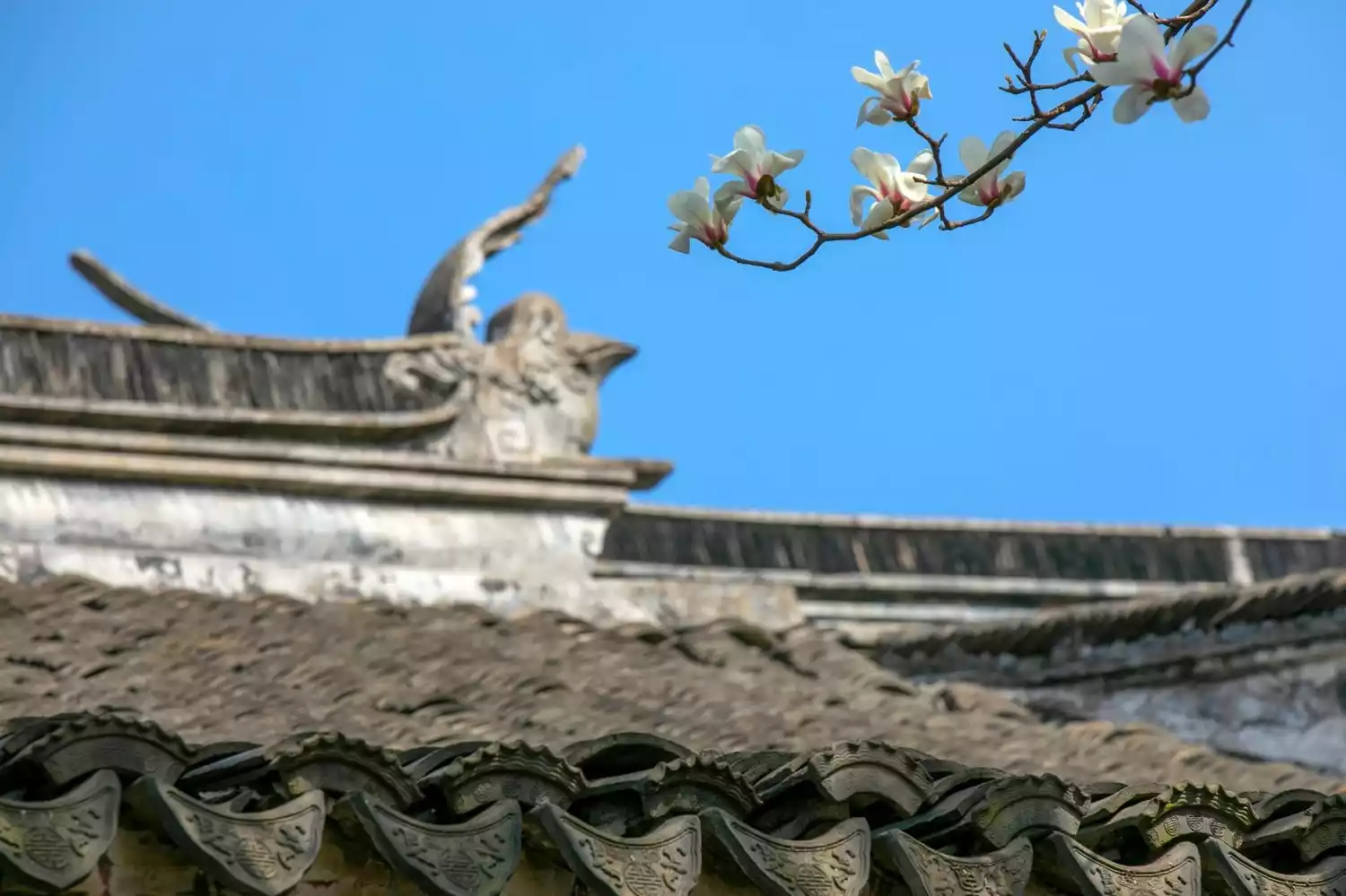 Magnolias have long been a favorite of scholars and writers. In Suzhou, magnolias are quietly in full bloom in gardens, parks, schools, residential areas, and even on the streets. Each blossom rises proudly from the branches, contrasting with the pink walls and black tiles, creating a truly classical beauty.