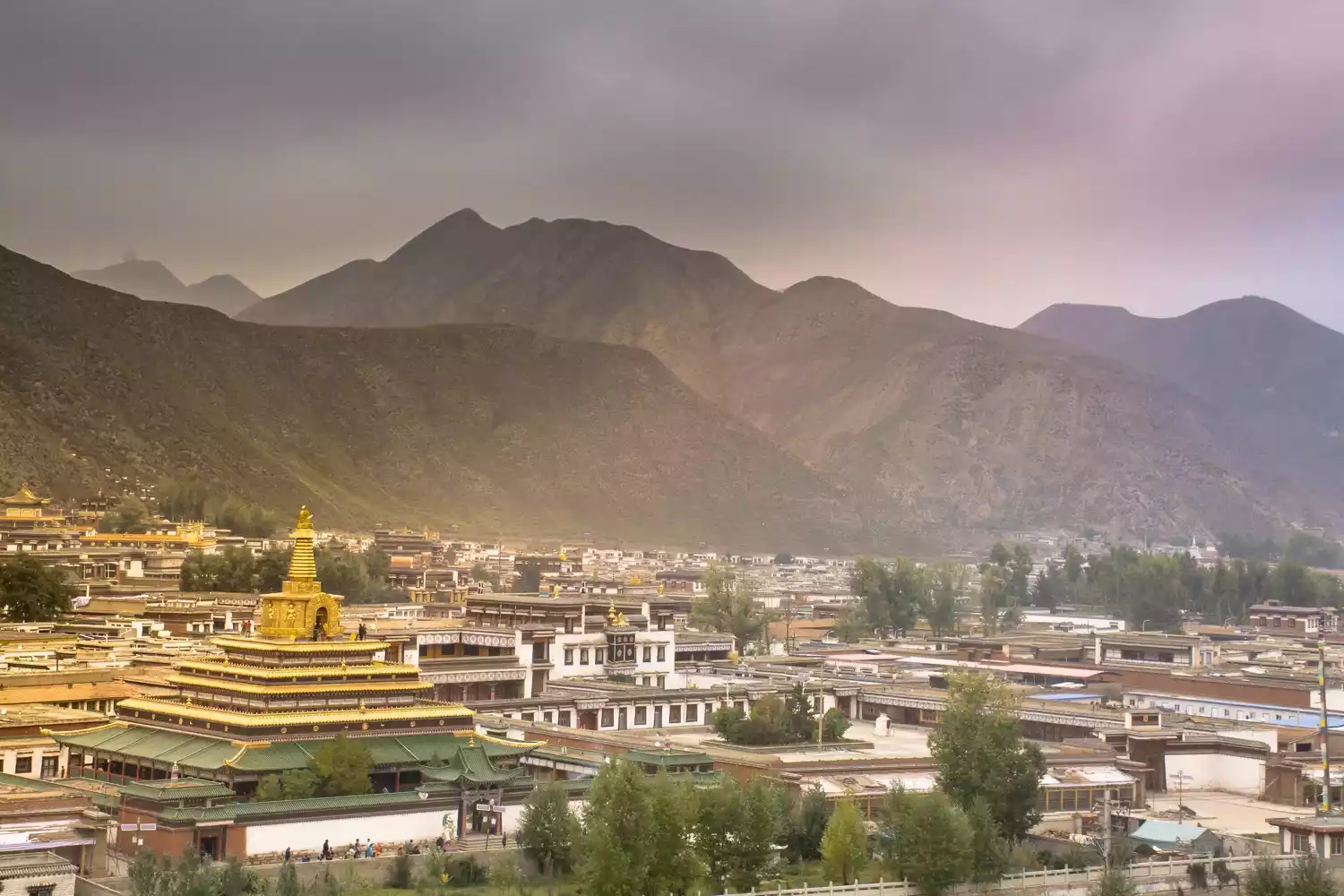 The unique terrain, with mountains at its back and the Daxia River running through it, offers a panoramic view of magnificent golden pavilions and palaces, second only to the Potala Palace in size, creating a peaceful and mysterious scene. For Buddhists, this is a sacred Pure Land where all doubts about spiritual practice can be resolved and enlightened.