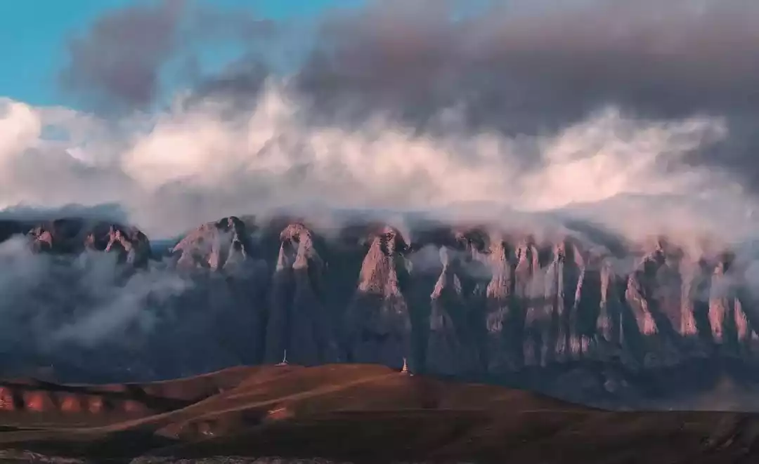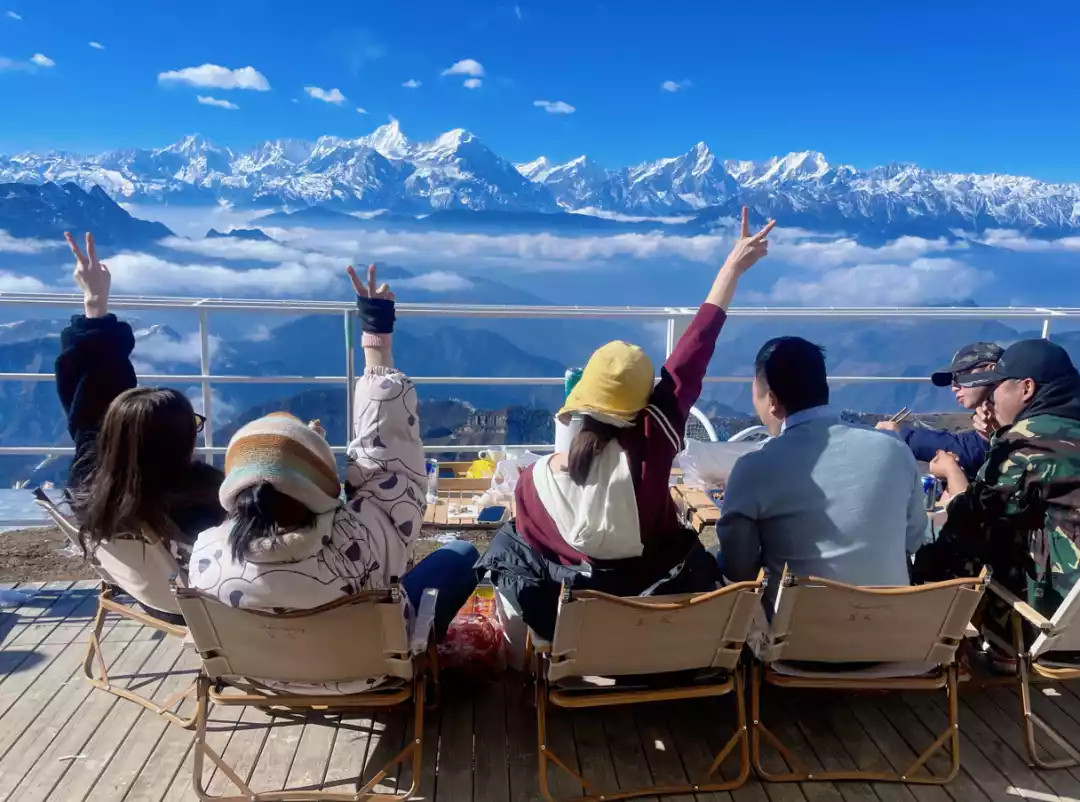 Standing here, you can take in the panoramic views of Gongga and Yala Snow Mountains, which sparkle in the sun. Every sunset, the entire mountain range turns pink, and the clouds transform into a fairyland.