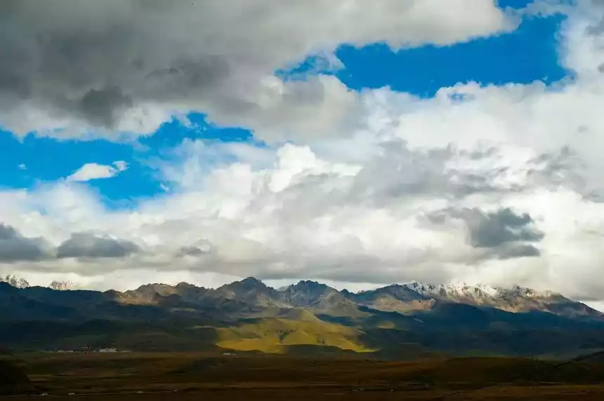 Overlooking the entire Jiangba grassland from the end of the road, and looking back at the Rainbow Highway, it seems like a sky road leading from the human world to the sacred mountain fairyland.