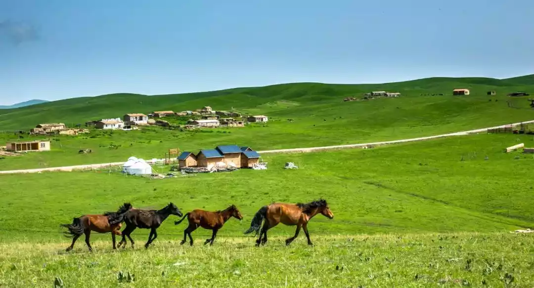 In June, a sea of unknown flowers adds a touch of color to the meadow. You'll also see Hequ horses, yaks, and marmots, and occasionally, you'll spot a marmot foraging nearby.