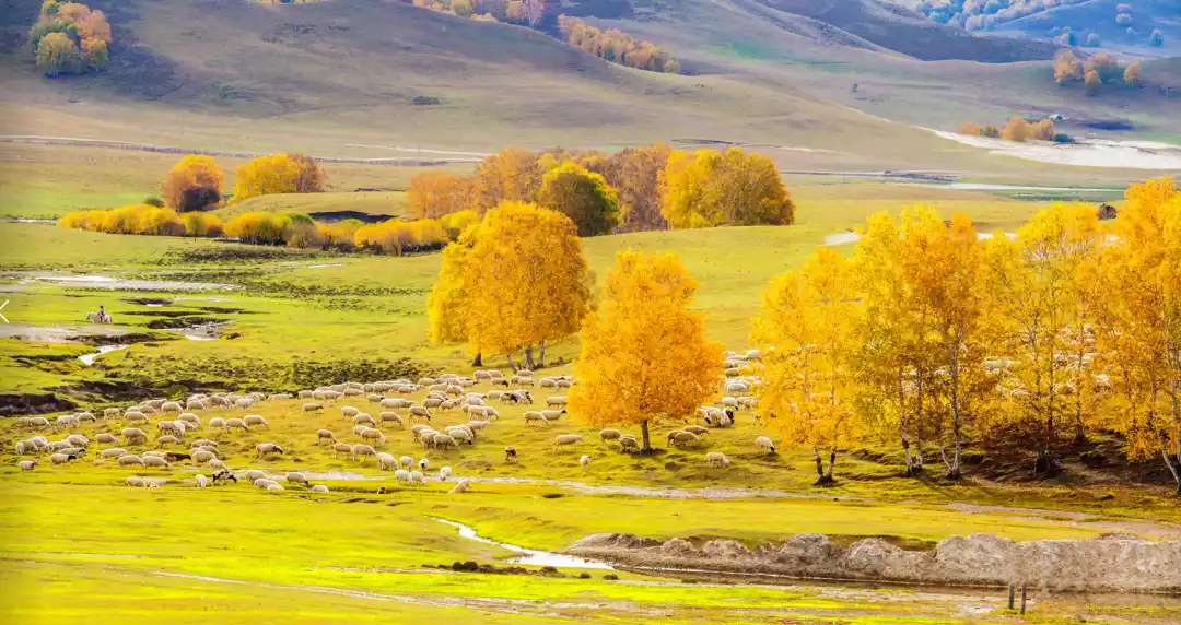 Hulunbuir in September is a warm orange autumn. Herdsmen on the grassland sing folk songs and graze cattle and sheep. The autumn colors spread across the earth, passing through the vast golden grassland of Hulunbuir, the shrub wetlands like oil paintings, and the grasslands with rolling hills.