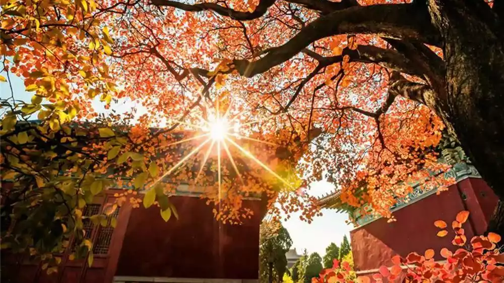 In the golden autumn, the whole Mount Tai is ablaze with colors, beautiful in its simplicity, warm in its dignity. The broad mountains are covered with fiery red frost leaves, making it the most colorful season of the year.