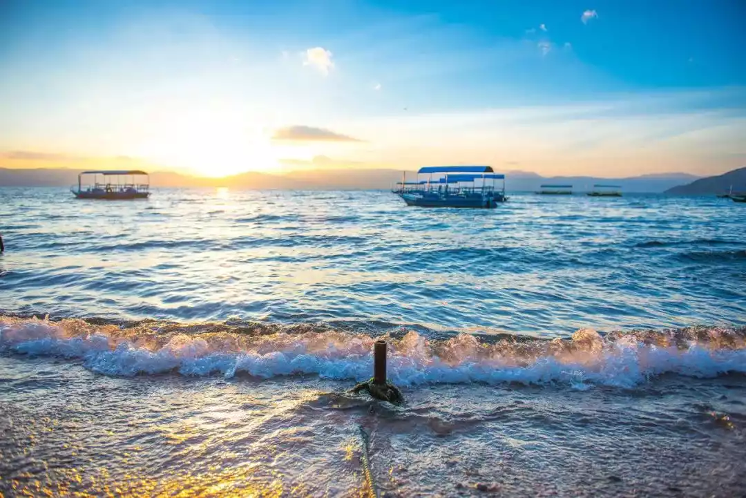 The reduced water supply during winter and spring, combined with the pristine blue sky, deepens the azure of Fuxian Lake. The unpolluted waters are crystal clear, and carefree red-billed gulls pierce the azure, creating an atmosphere of unparalleled peace.