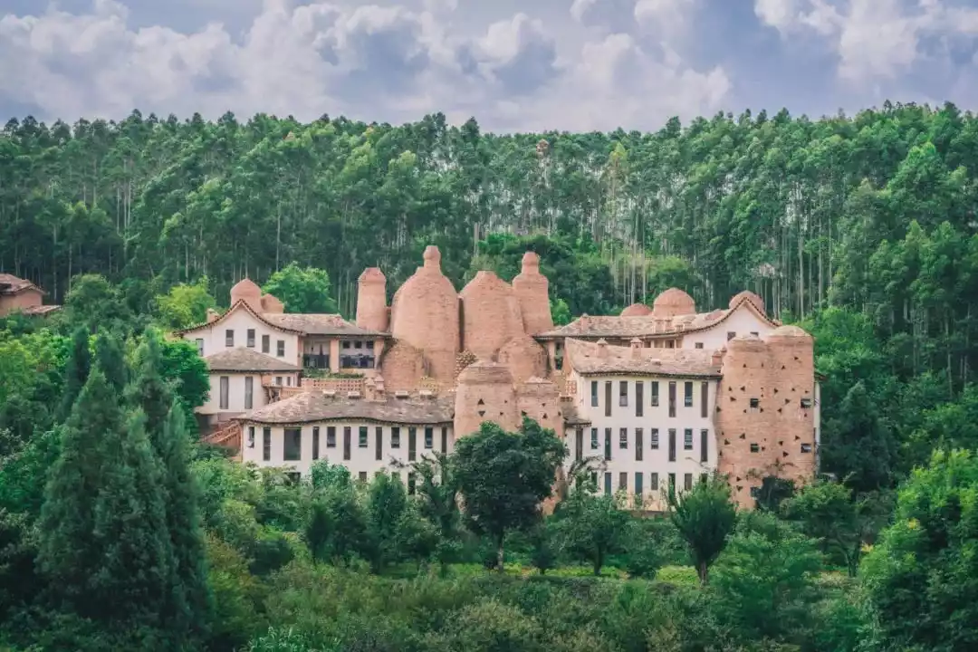 Inspired by the red wine culture (wine bottles) and the fire culture (flames) of the Axi people of the Yi ethnic group, this art castle, built with staggered red bricks, replaces traditional square windows with triangular wall holes. As time goes by, sunlight shines in from all directions, creating a shifting light and shadow, exuding a strong artistic atmosphere everywhere.