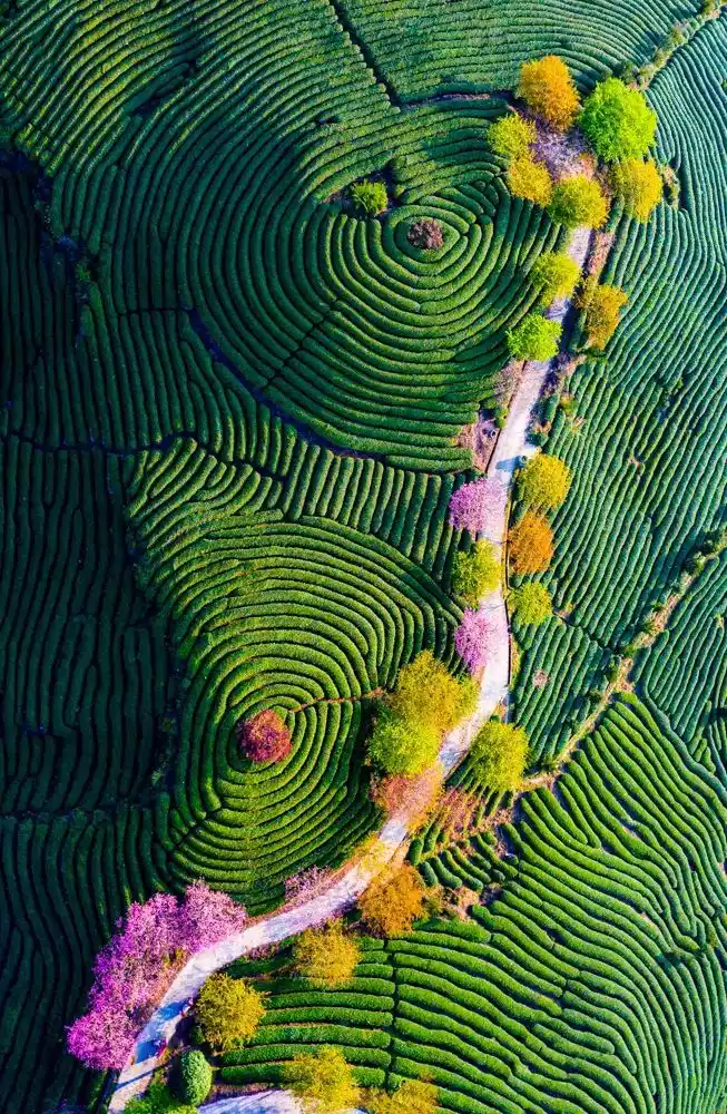 Wandering in the sea of flowers on the tea path, admiring the picturesque scenery, romantic spring cherry blossoms flying all over the sky, accompanied by the fragrance of thousands of acres of tea gardens, winding in an orderly manner on the hillside, is the most beautiful appearance of spring.