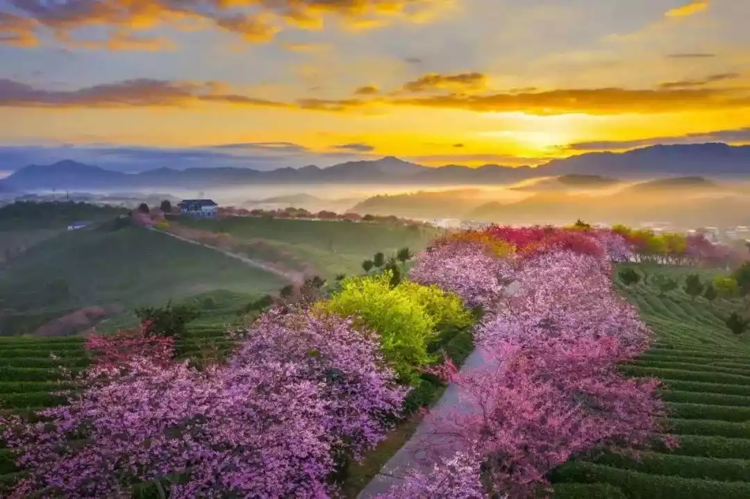 Rows of cherry blossoms, radiating in color, are scattered among neat rows of dark green tea bushes. The red is tinged with pink, and the pink is tinged with a touch of purple. They are spread out in the tea garden in an orderly manner, blooming freely along the winding hillside, with distinct layers and a beautiful sight.