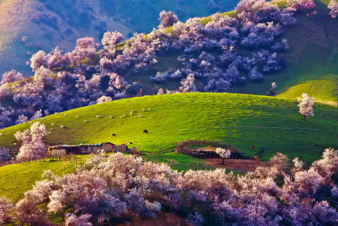 In the early morning, the sun rises slowly behind the hillside. The apricot blossoms in the sunlight are as charming as the rouge on a girl's cheeks. In the distance, there are snow-capped mountains, cattle and sheep, and herdsmen's small houses hidden in the apricot forest, perfectly presenting the charm of spring in Xinjiang!