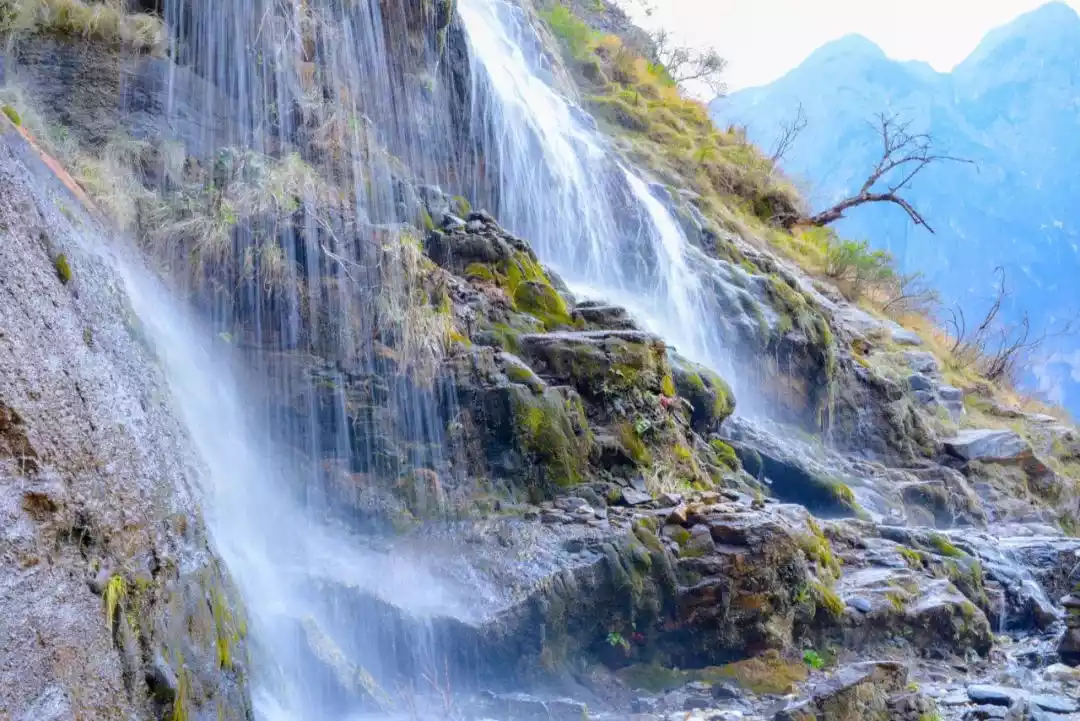 Continue walking from the Midway Inn, and after about half an hour, you will encounter a waterfall falling from the sky, rushing down from the valley, rushing to the bottom of the valley, and passing through it.