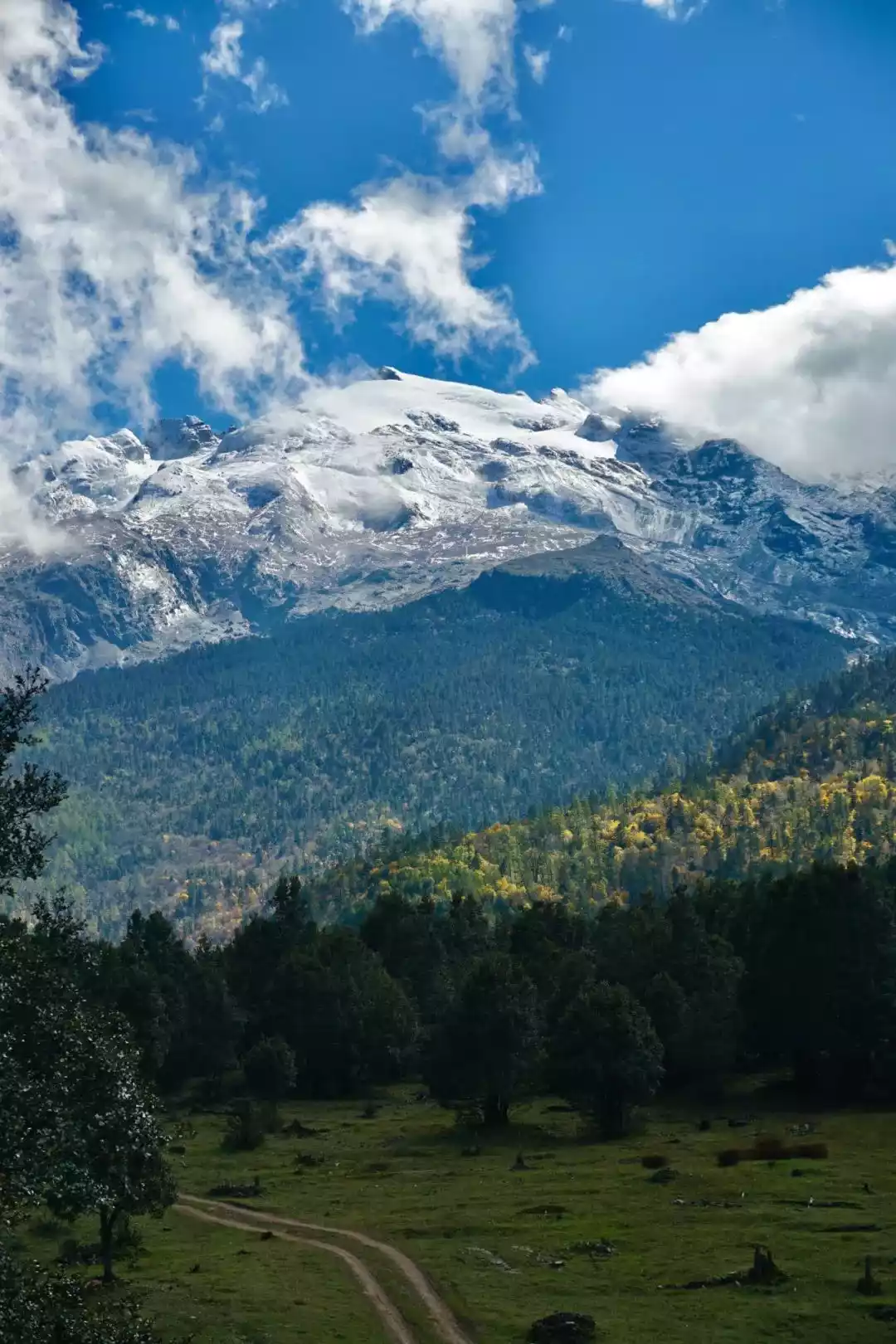 The main peak of Haba Snow Mountain is 5,396 meters above sea level, and the lowest point, Jinsha River Valley, is only 1,550 meters above sea level. Due to the huge difference in altitude, the natural landscape here is rich and diverse.
