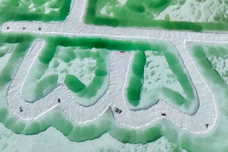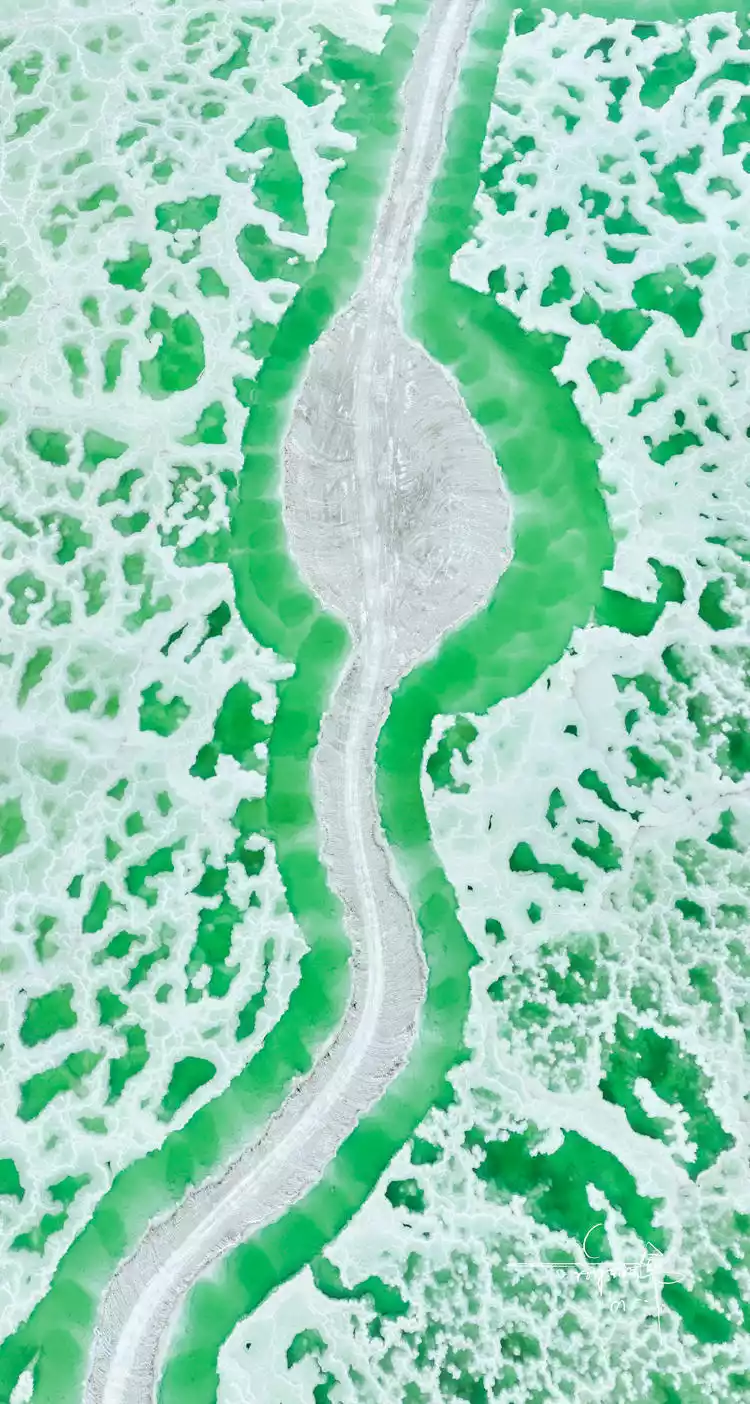 The water of Emerald Lake is even more emerald green, emerald green. White salt flowers dot the lake, giving it a pure, clear appearance. These white salt flowers divide the vast expanse of emerald green into grids and patches.
