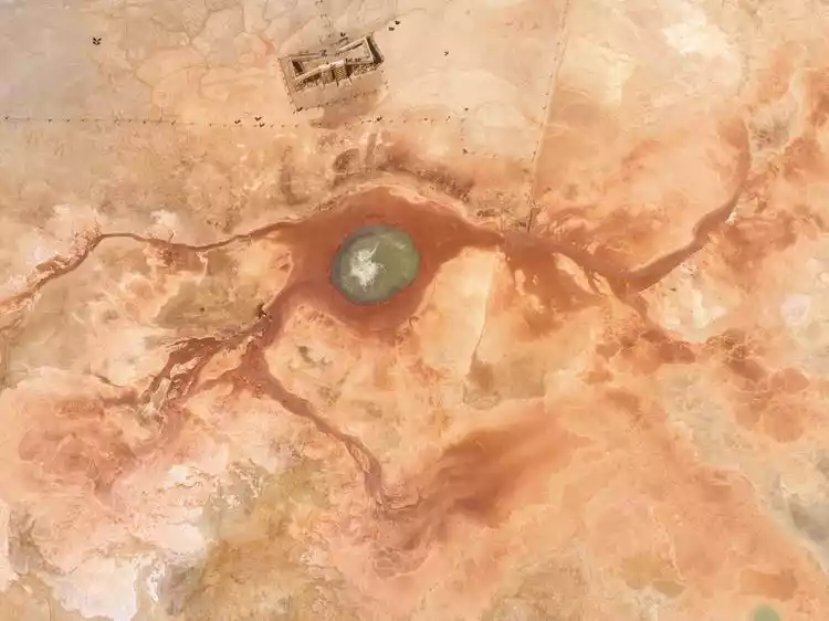 Aiken Spring, with a diameter of over 10 meters, gushes and rises like boiling water. Sulfur minerals have long been deposited around the spring, creating a vibrant color. From an aerial view, the spring, its gushing water, and the crimson, ring-like sediments on the surrounding land form a unique pupil-like shape, resembling an eye embedded in the earth.