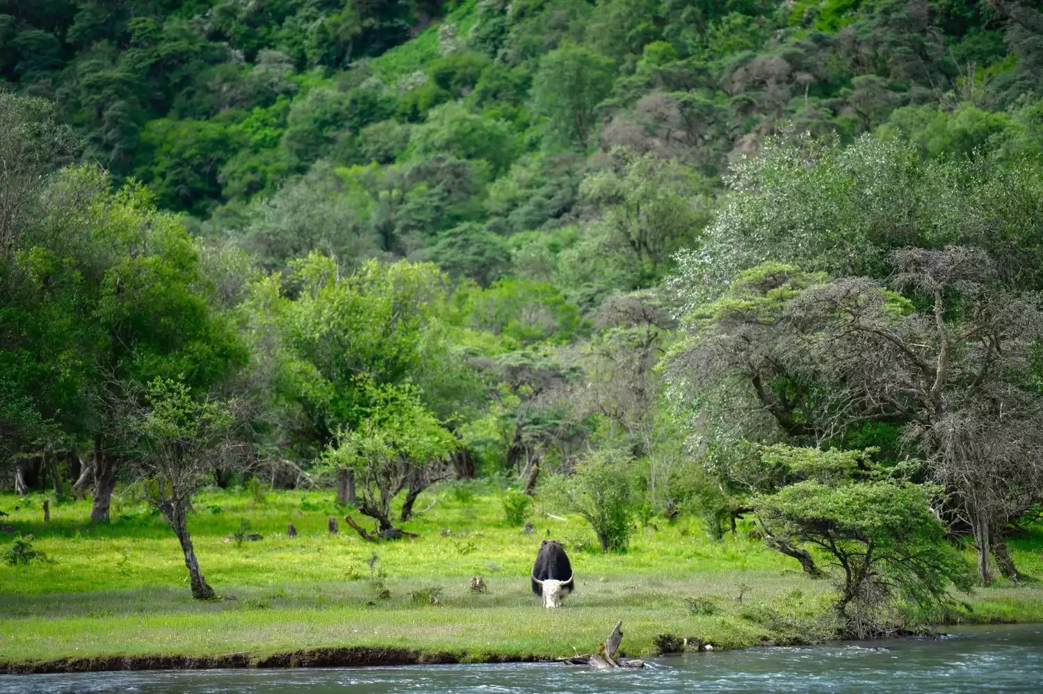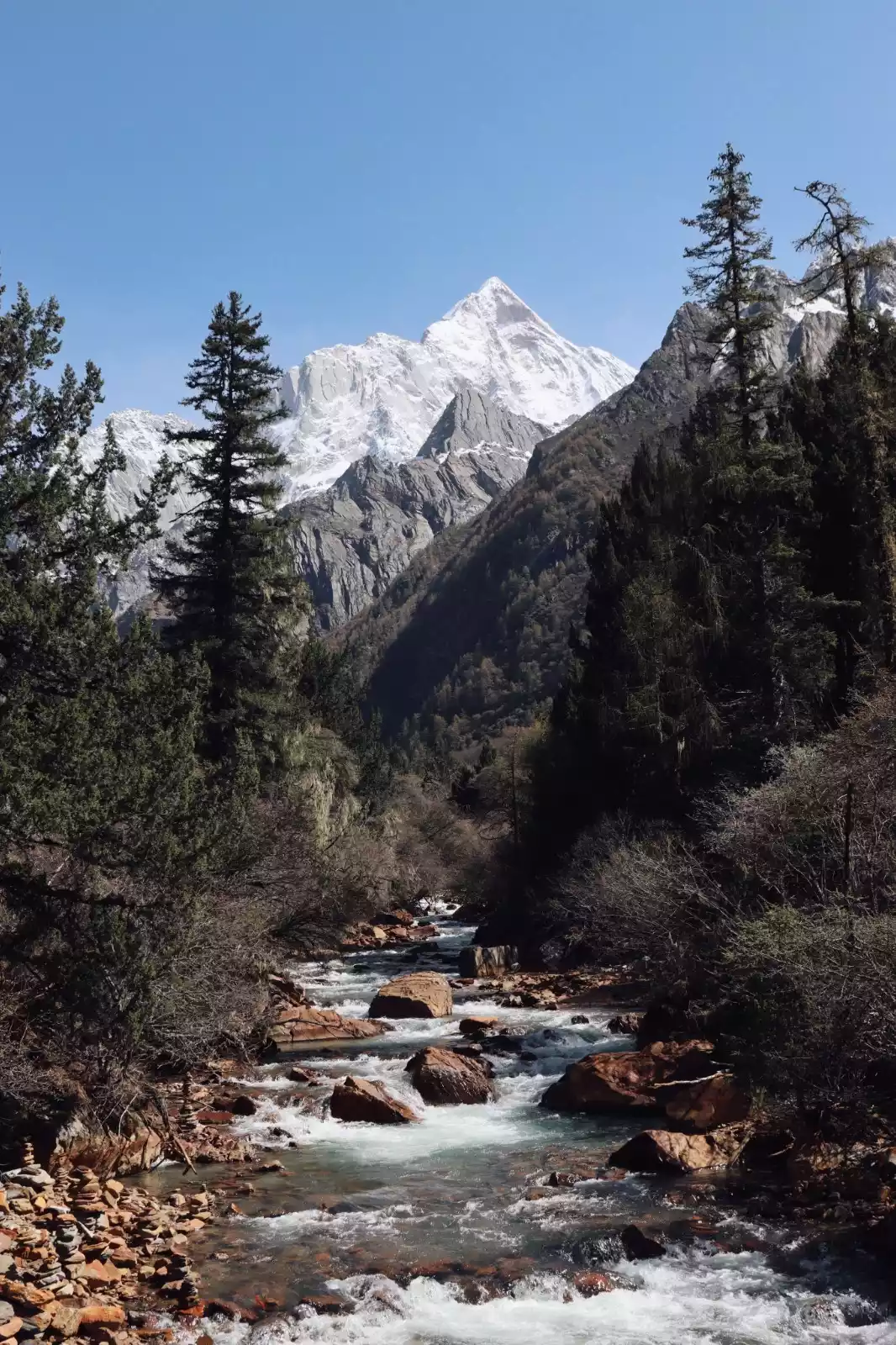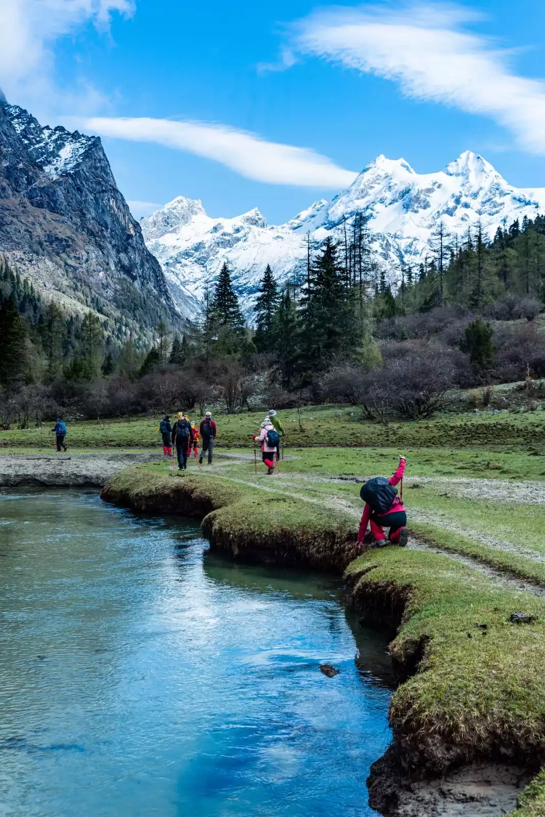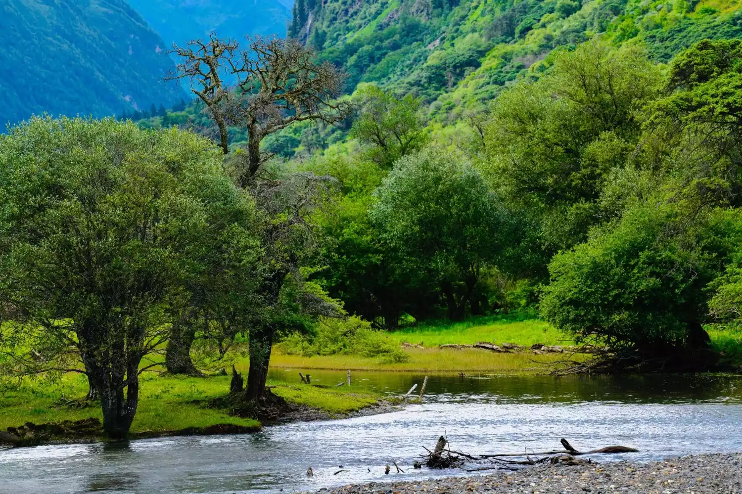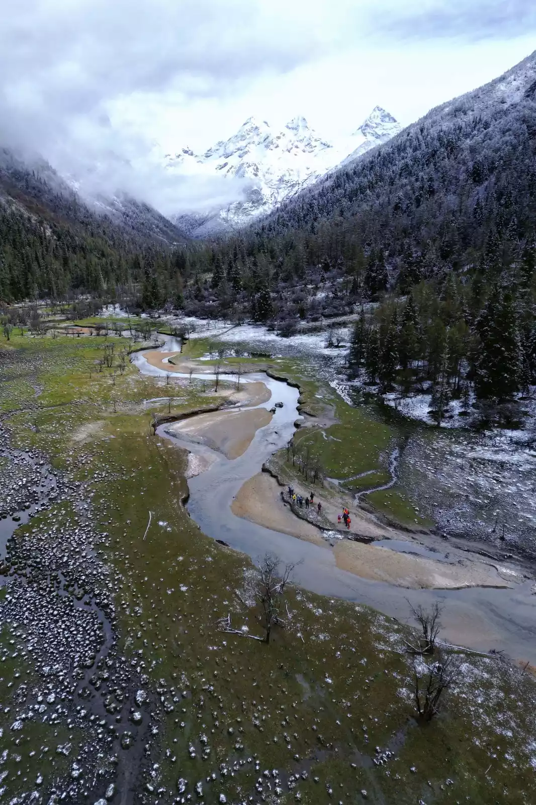 While you can't see the main peak of Siguniang Mountain from here, you can see its "bath pool." It's like the valley is surrounded by mountains on both sides, each one distinct. From afar, the peaks appear majestic, with withered trees and twisted branches entwined. Up close, the flowing water appears gentle, sometimes ripples, sometimes swift, like a waterfall, sometimes flowing through gravel and sometimes emerging from the weeds.