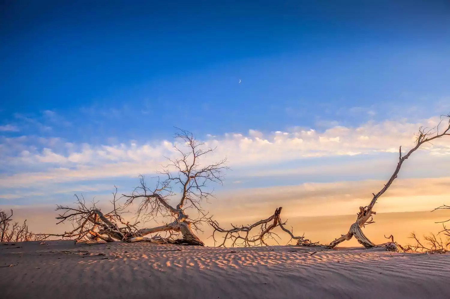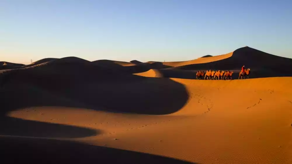Badaoqiao is located on the edge of the Badain Jaran Desert, where poplar forests coexist with the desert. At sunset, we'll watch the golden sands cast a captivating halo across the desert. We can also capture the winding sand dunes and the shadows of desert camels.