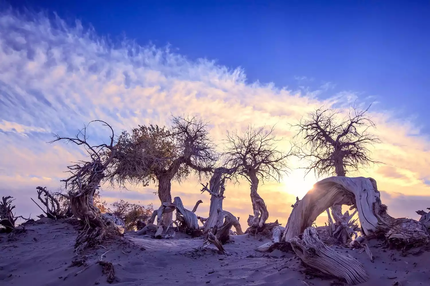 As autumn arrives, the poplar trees, their green leaves turning yellow, stand tall in the desert beneath a clear, azure sky, as bright and radiant as the sun. When a cold wind blows, the tree's splendor transforms into a blanket of golden light, the final movement of life in full bloom. Each leaf holds up the sun, each vein brimming with energy. Sunlight flickers through the leaves, and annual rings condense on the branches.