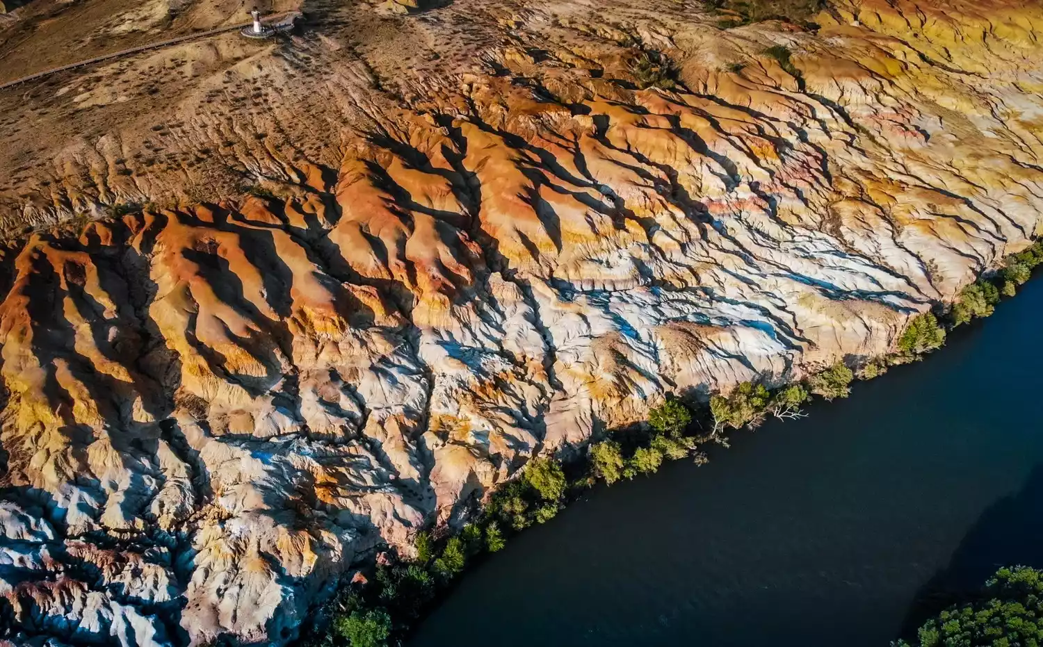 The south bank is a vibrant oasis, while the north bank boasts the magical Yardang landform, with its crisscrossing ravines and shifting colors under the light and shadow, creating a bizarre and mysterious scene. The sunset at Wucai Beach is particularly breathtaking, with the warm, infinite light of the setting sun illuminating the beach, the luminous river, and the golden poplar trees.