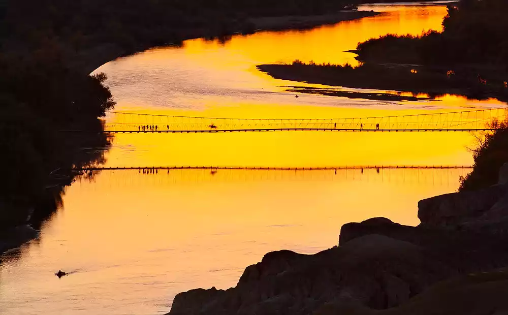 Erdao Bridge is full of primitive charm, with a wide waterway and the clear autumn water reflecting the golden poplars. It is also set against the backdrop of yurts and rolling sand dunes. It is the best spot to take pictures of reflections, sunsets and night scenes.